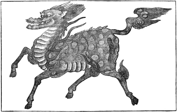 [304] “The Chinese have a tradition that this animal skips, and is so holy or harmless that it won’t even tread upon an insect, and that it is to come in the shape of an incomparable man, a revealer of mysteries, supernatural and divine, and a great lover of all mankind, who is expected to come, about the time of a particular constellation in the heavens, on a special mission for their benefit. The Japanese unicorn answers the description of the animal bearing that name, and supposed to be still extant in Ethiopia, and which is equal to the size of a small horse, reddish in colour, and slender as a gazelle, the male having one horn. The unicorn is the ancient crest of the kings of Israel, and is still retained by the Mikado.” Epitome of the Ancient History of Japan, p. 116; N. McLeod, Nagasaki, 1875.