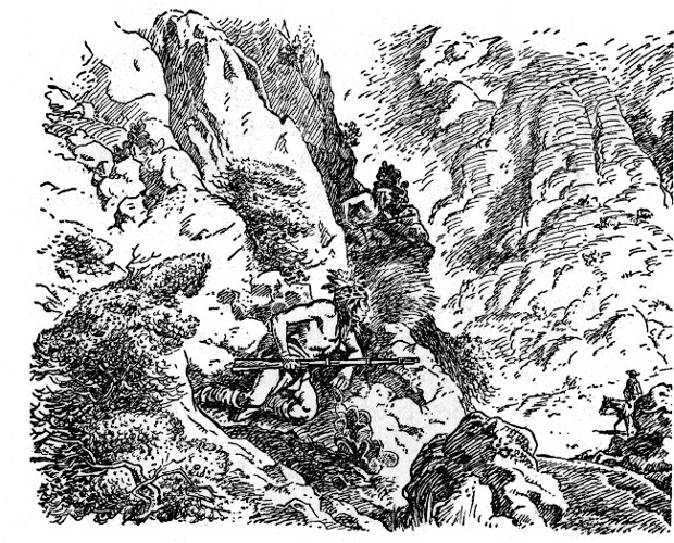 Geronimo crawled up the hill so carefully that no stalk of grass moved, and no bush quivered. A pair of crested quail, feeding on insects in the grass, merely glanced up when he passed and went on feeding. Geronimo reached the top of the hill and crouched down in the grass.