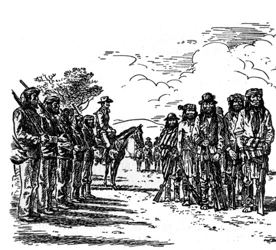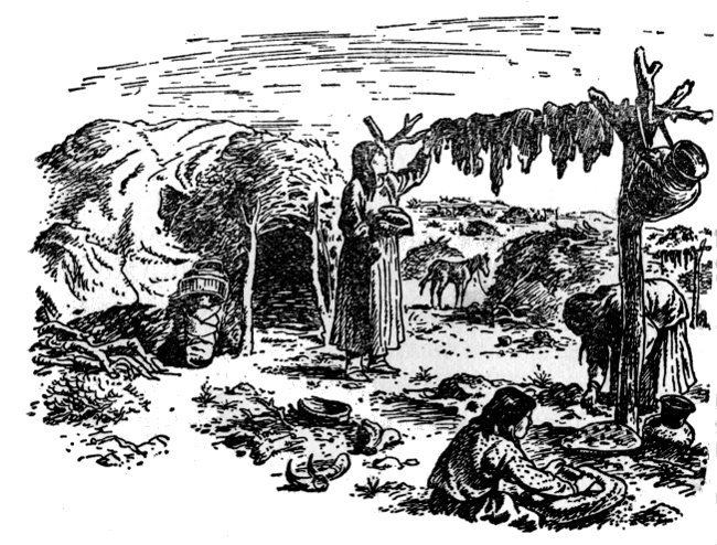 Geronimo looked down the slope on a wickiup. This Apache house was built of poles thrust into the ground, with deer skin walls and a smoke hole in the center of the roof. It was the home of Delgadito, a mighty chief among the Mimbreno Apaches, the tribe to which Geronimo belonged. Delgadito was so mighty that only the great chief, Mangus Coloradus himself, outranked him.