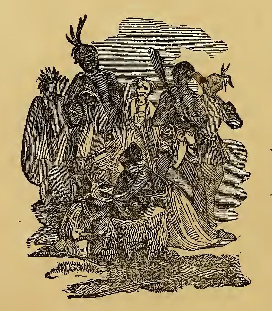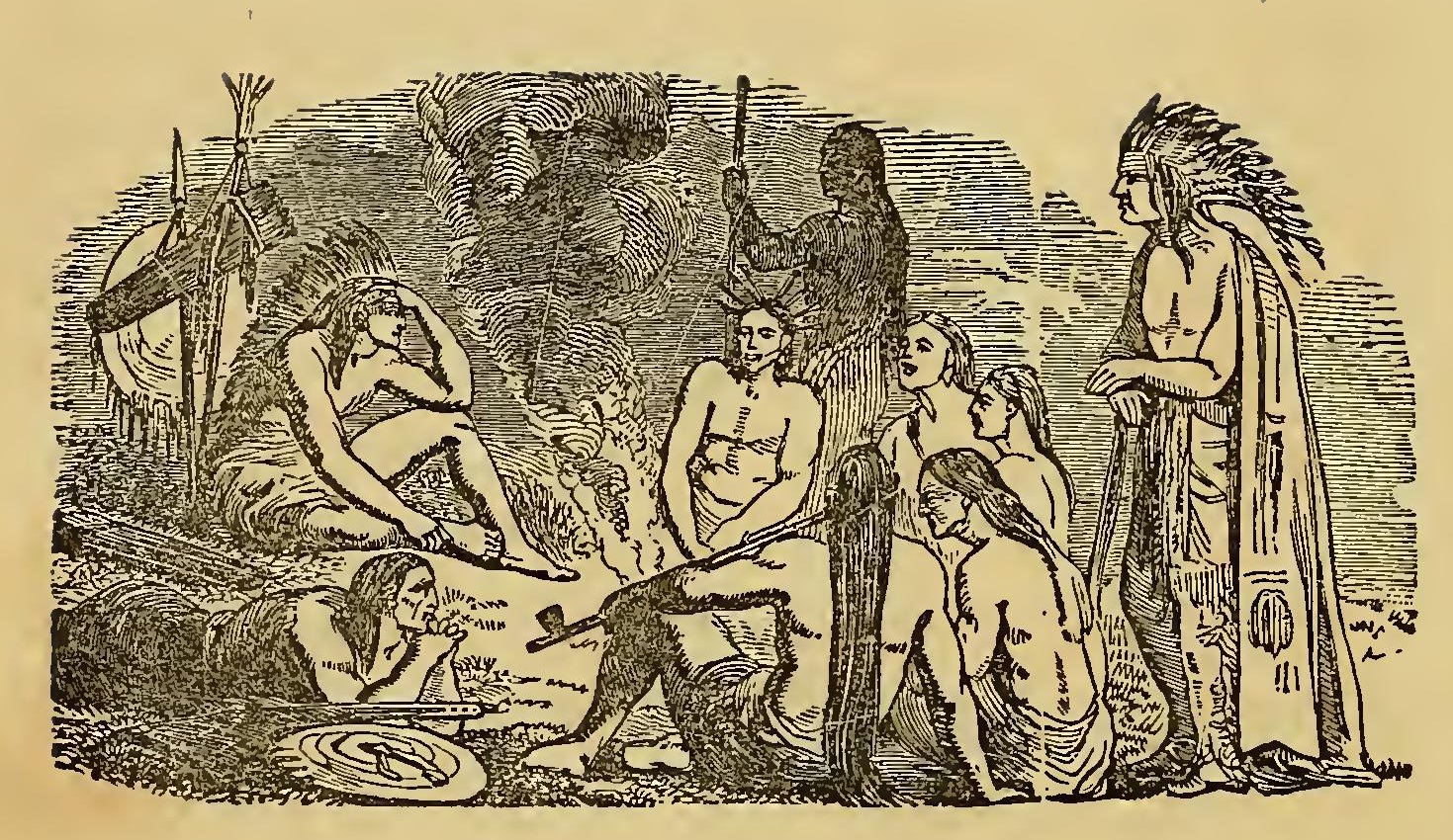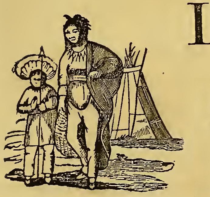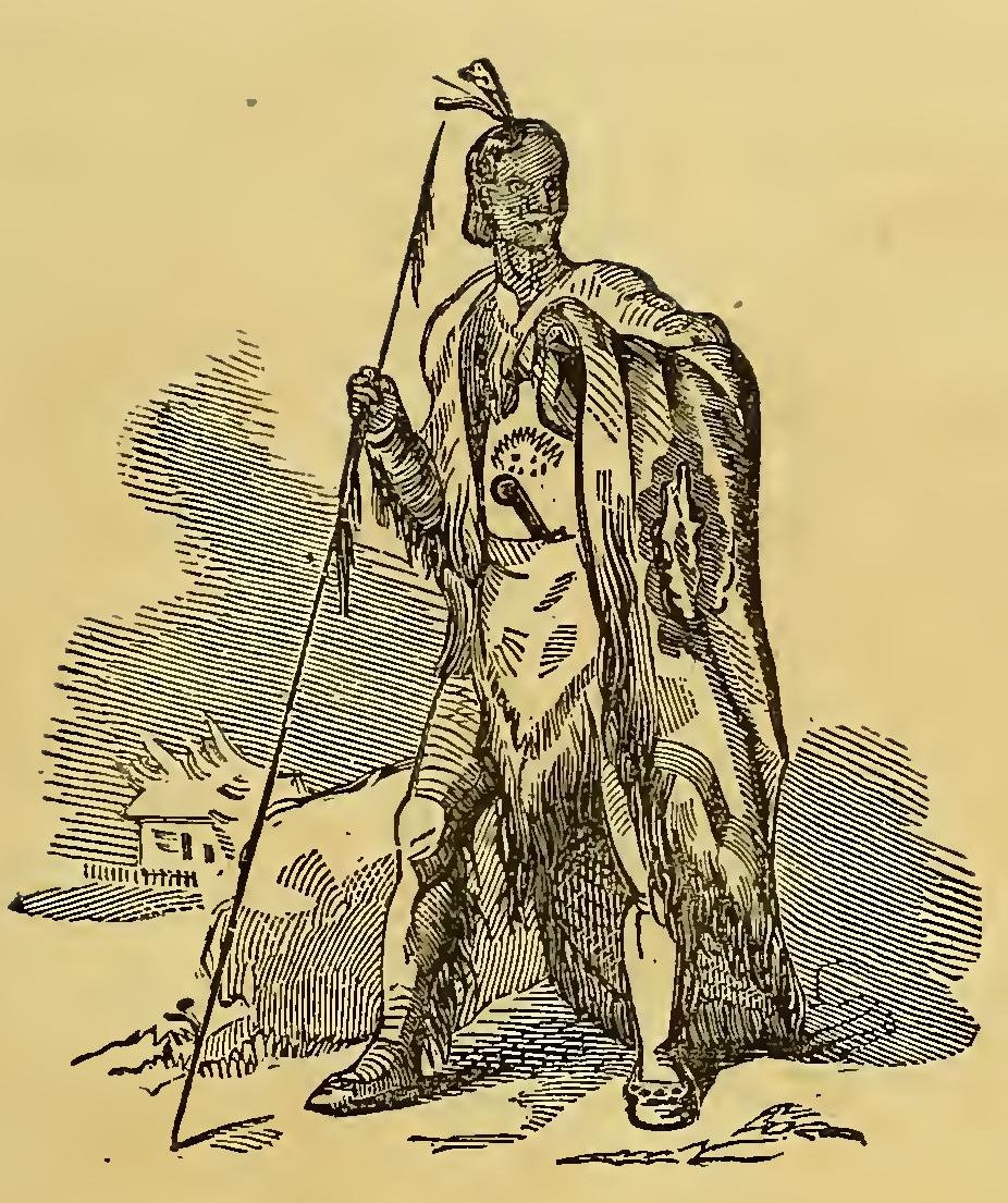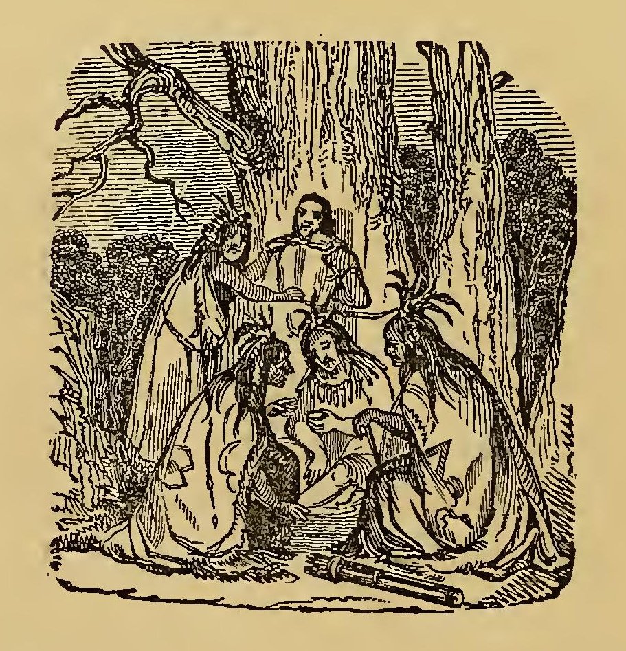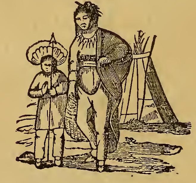 URING the frequent wars between the Indians and the early settlers of New England, the former defeated a party of English soldiers. Their retreat was without order; and a young English officer, in attempting to escape, was pursued by two savages. Finding escape impracticable, and determined to sell his life as dearly as possible, he turned round to face his foes. A violent struggle commenced, and he must have fallen, if an old chief had not thrown himself between the combatants. The red men instantly retired with respect. The old man took the young officer by the hand, dispelled his fears, and led him through the forest to his wigwam, where he treated him with the greatest kindness. He seemed to take pleasure in the youth’s company; he was his constant companion; he taught him his language, customs, and arts. Thoughts of home would sometimes haunt the young Englishman. At these times, Wanou would survey his young friend attentively, and the tears would fill his eyes.