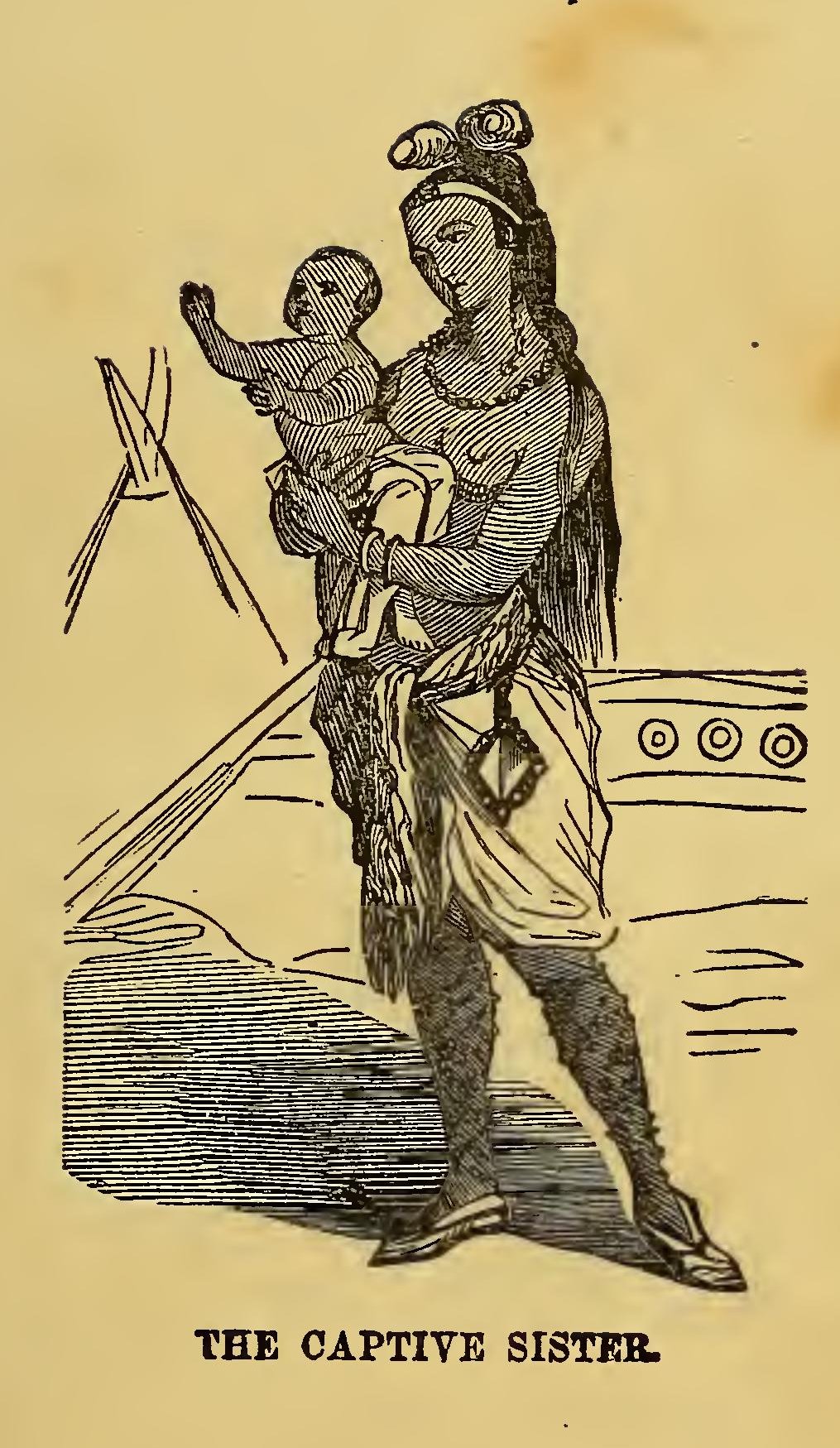 In 1778, the family of Mr. Jonathan Slocum, near Wilkesbarre, (Campbell’s Wyoming,) Pennsylvania, was attacked by Indians. Within the house were two girls, aged nine and five years, a son of thirteen, a little boy of two and a half, and their mother. The men were working in the field, and two youths were in the porch grinding a knife. One of the latter was shot and scalped with his own knife. The eldest sister seized the little boy and ran with him towards the fort. The Indians took the boy who had been turning the grindstone, young Slocum, and his sister Frances, and prepared to depart. Little Slocum being lame, they set him down, and proceeded on their way. One of the Indians threw the little girl over his shoulder, and her weeping face was the last object of the mother’s gaze.