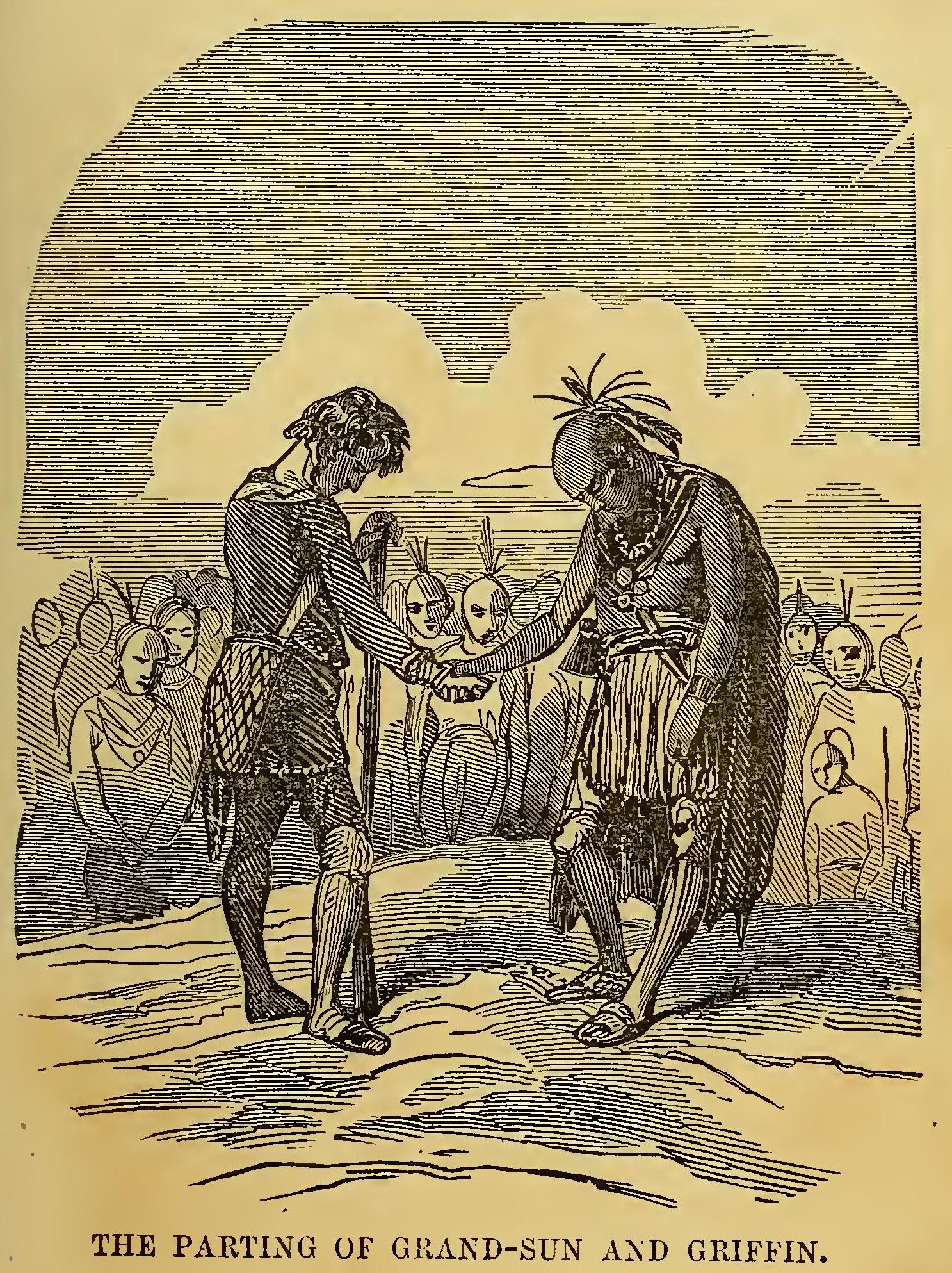 About sunset the day before the massacre, Griffin and Grand-Sun, who had been out hunting during the day, arrived at the verge of the village of White Apple. A crowd of red men were assembled to welcome their great chief. The friends stopped upon an elevated piece of ground near the Indians. Grand-Sun had just been urging upon his friend the removal of his family from the fort. But as Griffin had given signs of beginning to suspect something wrong, he suddenly checked his persuasive appeal and taking his hand, thus bade him farewell for ever.