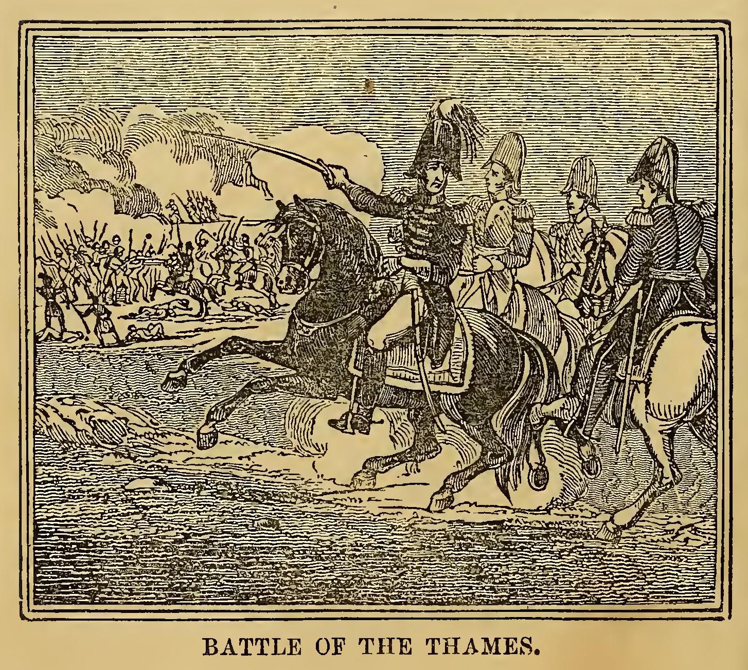 When the war broke out between Great Britain and the United States, Tecumseh seized the opportunity to join the British general with a large body of his warriors. He received the commission of brigadier-general in the British army. During the latter part of his active life, he was under the direction of General Proctor; but is said to have been greatly dissatisfied with his proceedings. After Perry’s victory on Lake Erie, Proctor abandoned Detroit, and retreated up the Thames, pursued by General Harrison, with the American army. Harrison overtook him near the Moravian town, on the 5th of October, 1813. By a novel manoeuvre, ordered by Harrison, and executed by Colonel Johnson, the British line was broken and put to flight.