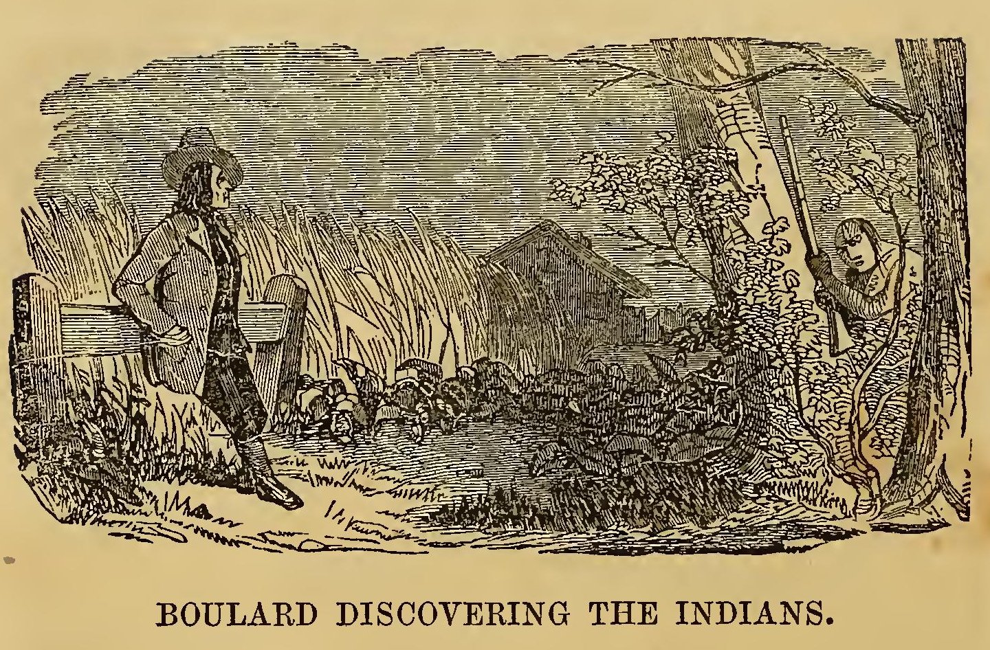 Just before day break, on the morning of the 26th, the whole body of the Indians crossed the river, and advanced towards the settlement, endeavoring to make their march as secret as possible. The great body of the French settlers were reposing in security, but here and there an early and industrious farmer was abroad, looking after his farm and cattle. One of these, named Boulard, was the first to discover the approach of the enemy. He was walking down his lane, between a thicket and his wheat-field, when he heard a strange rustling in the bushes, at a little distance, and he stopped and leaned against a fence to observe what caused it. Boulard had not waited long before he caught sight of the form of two or three red men coming through the wood, and he was discovered by them at the same time.