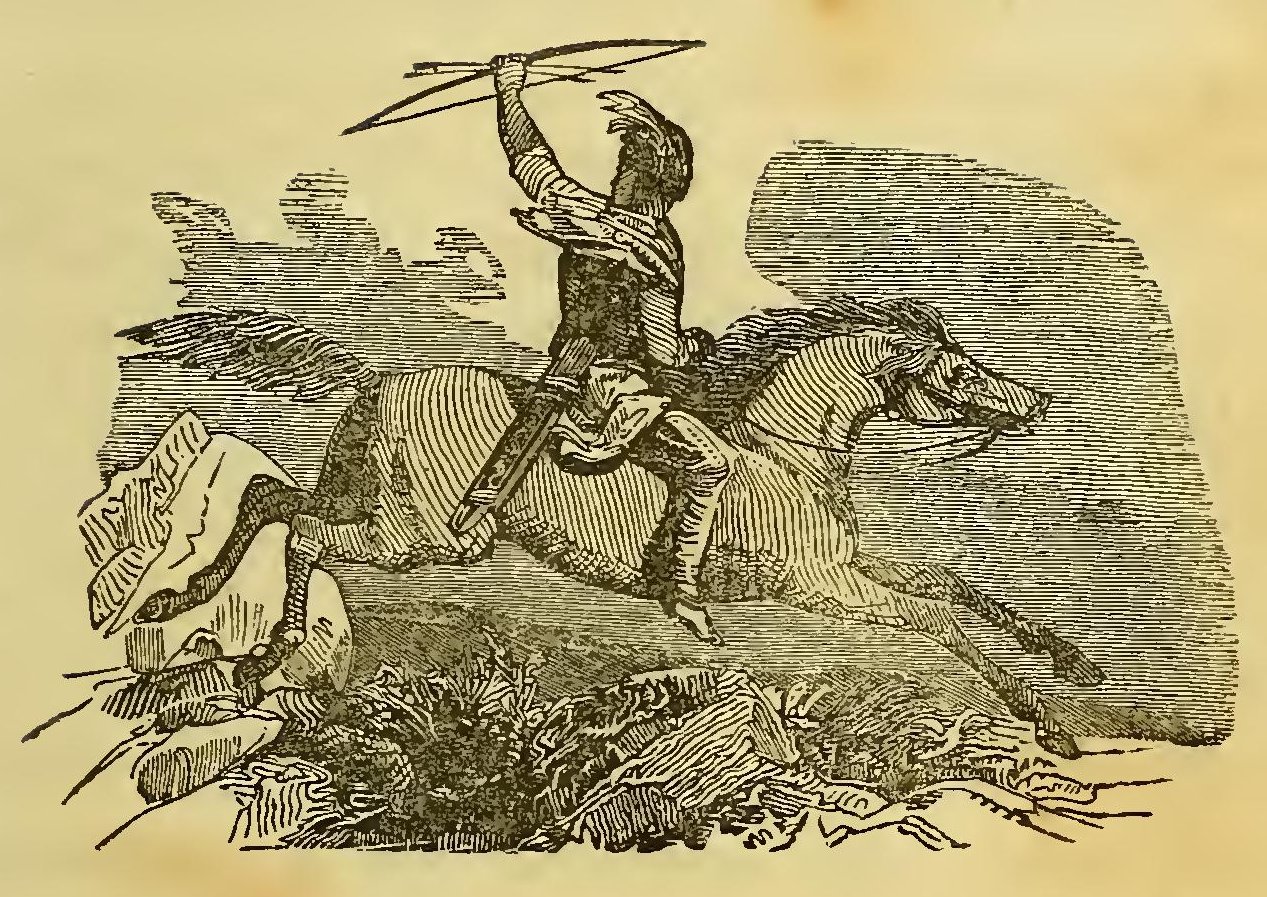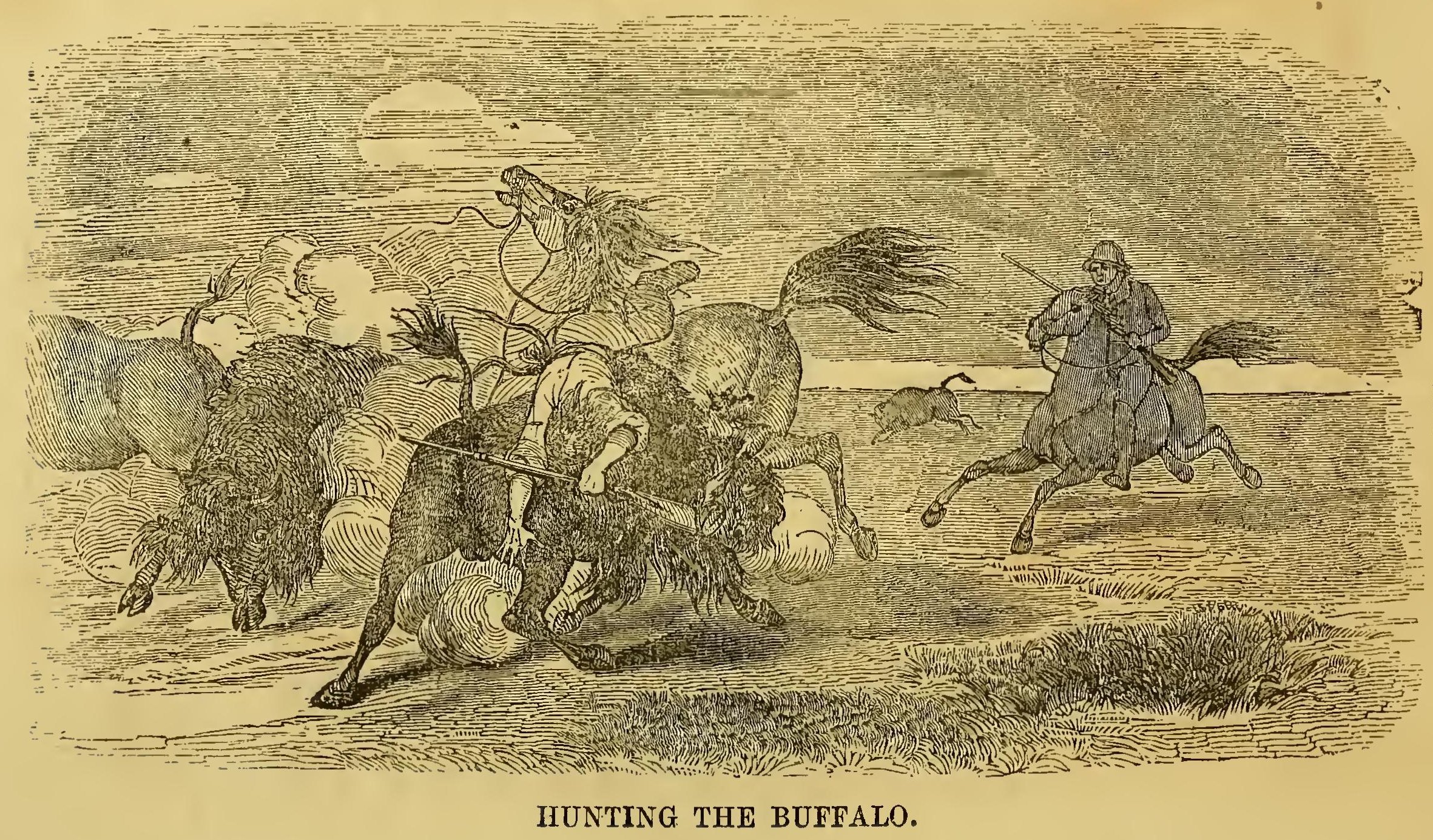 HE buffalo hunt, next to the Indian battle, is the most intensely exciting scene which may be witnessed among the wilds of the west. To the buffalo, the Indian looks for food, for clothing, and for religious and household implements. He regards the hunting of that animal not only as a pleasure, but a duty; and when once it is rumored through a village that a herd of buffalo is in sight, their warriors who have faced death in a hundred forms, bring out their swiftest horses, and spring upon them; and when the whole party rush across the field eager to engage the bellowing herd, a scene is presented for which it would be in vain to look for a parallel, even among the cane-brakes of Africa, or the jungles of India.