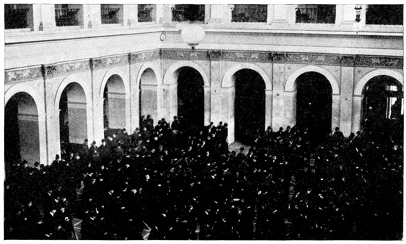 The train was due in Berlin at 9 o'clock at night, but we were late when we pulled in at the Stettin Station. We had a hard time getting a cab and finally we had to share an automobile with a strange man who was going to the same hotel. At 10 o'clock we were in our hotel on Unter den Linden. From the window I could look out on the linden trees. The lights were twinkling merrily in the cafés across the way. Policemen were holding up the traffic on the narrow Friedrichstrasse. People were everywhere. It did not seem like a country that was taking part in the great war. 7