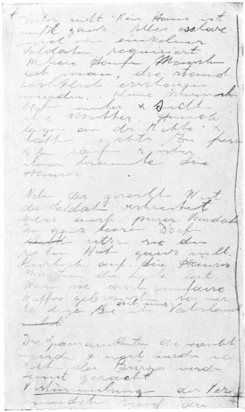 25th August (in Belgium): Three hundred of the inhabitants were shot and the survivors were requisitioned as grave-diggers.[Pg 19] You should have seen the women at this moment! But you can’t do otherwise. During our march on Wilot, things went better: the inhabitants who wished to leave could do so and go where they liked.[16] But anyone who fired was shot. When we left Owele, shots were fired: but there, women and everything were fired on[17]....