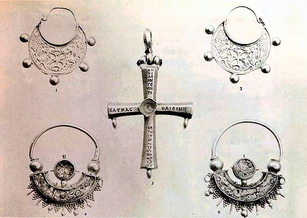 1-4. Four gold earrings. p. 9. 1. Chrysalis form. 2-3. A pair: birds perched above a bushel of grain. 4. Long oval ring terminating with a cross.