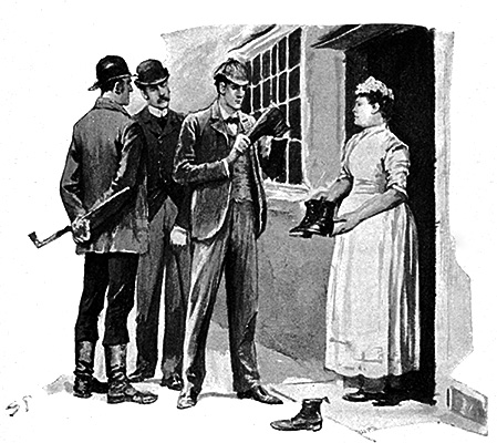 “It is simplicity itself,” said he; “my eyes tell me that on the inside of your left shoe, just where the firelight strikes it, the leather is scored by six almost parallel cuts. Obviously they have been caused by some one who has very carelessly scraped round the edges of the sole in order to remove crusted mud from it. Hence, you see, my double deduction that you had been out in vile weather, and that you had a particularly malignant boot-slitting specimen of the London slavey. As to your practice, if a gentleman walks into my rooms smelling of iodoform, with a black mark of nitrate of silver upon his right forefinger, and a bulge on the side of his top-hat to show where he has secreted his stethoscope, I must be dull, indeed, if I do not pronounce him to be an active member of the medical profession.”