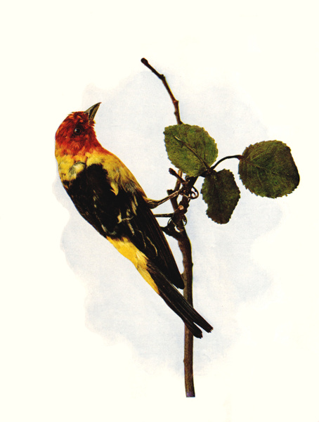 The Louisiana Tanager is a Western species, ranging from British Columbia on the north to Guatemala on the south, and from the Missouri river to the Pacific coast. Our illustration well represents the male. The female, like its sister tanagers, is plainly colored, but still beautiful. It is olive green, with the underside yellowish. The feathers of the wings and tail are brown, edged with olive. It resembles the female Scarlet Tanager. The young are at first like the female. Then appears the black of the back, mixed with some olive and a slight tinge of red on the head.