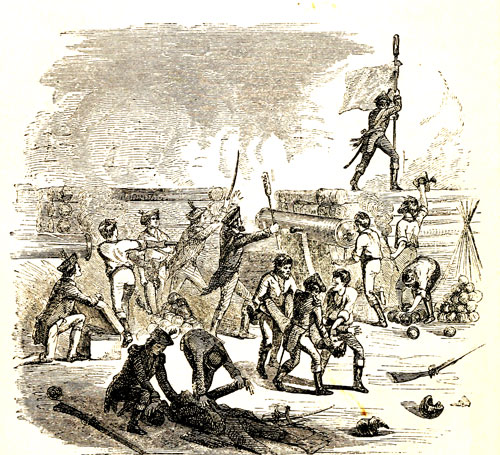Here is a picture of that sad scene. The cannonading is still going on, while they are carrying away from the ramparts two wounded men. You see in the picture, they are feeling the heart of one of them, hoping that it still beats. Do you see the brave fellow who is planting the flag? I must tell you about him. He is a Mr. Hart. When Mrs. Anderson wanted to go on to Charleston to see her husband, whose health was very delicate, Mr. Hart escorted her. He stayed in the fort, and was there during the fight. When our glorious flag was shot down, Mr. Hart seized it, nailed it to a pole, bounded up on the ramparts, and planted it again, amidst the cheers of the men. I think it was a splendid thing to have[34] done! General Anderson has that stained, torn, but priceless flag now; and he says he is only waiting to plant it once more with his own hands over Fort Sumter. He has one dear little boy, who is named Robert after him. I think Robbie, as they call him, ought to be a proud boy; for his father will leave him what is far above untold gold—a spotless and honorable name.
