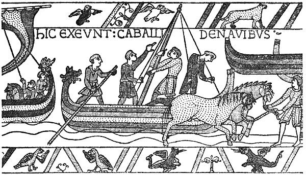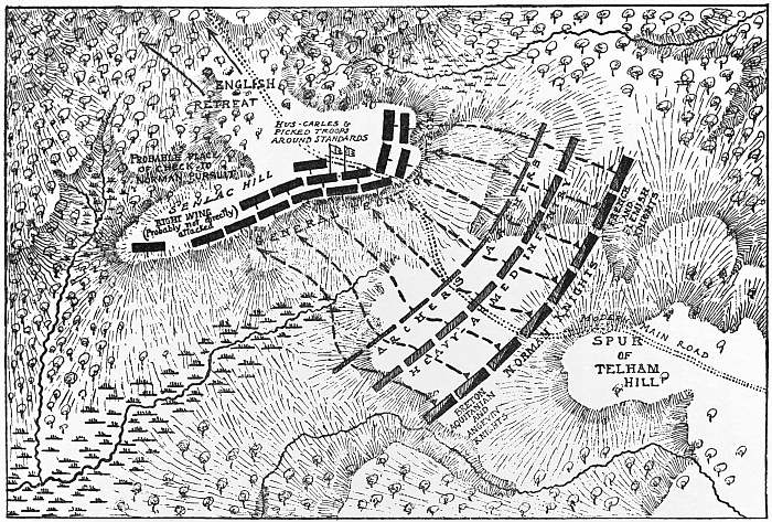 The field of Senlac has been examined by the authors in the company of Sir Augustus Webster, Bart., the present owner of Battle Abbey, himself a practical soldier. The result of their investigations has been to convince them that the line of the Norman advance lay considerably to the east of where it is generally placed, and that the great bulk of Harold’s army was massed about the site of the abbey itself. His right wing, being almost unassailable owing to the protection given to it by the marshy ground in its front, was probably very weakly held. Relying on the contemporary evidence of the Bayeux tapestry, and considering the circumstances of Harold’s march, the authors are inclined to discount any effective entrenchments or palisading.