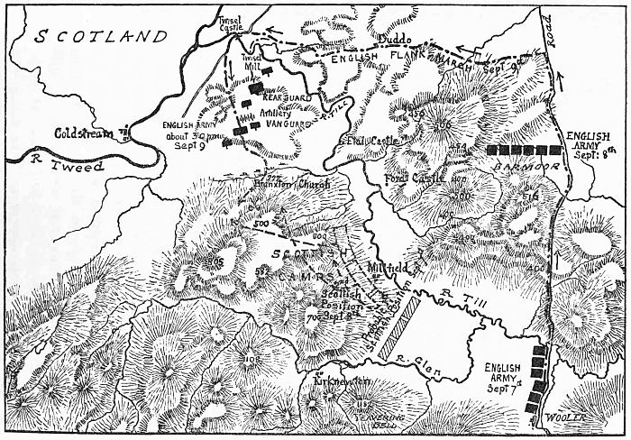 In regard to the strategy and tactics of Flodden, a close study of contemporary documents andix authorities tends to emphasize certain features which are often overlooked or ignored. First, the Scottish army evidently changed its position twice to counteract Surrey’s puzzling flanking movement. Second, it can have had no proper service of scouts, and was too cumbrous to manœuvre readily, circumstances which left it at the mercy of its numerically inferior antagonist. Third, it was never able to form a complete line of battle owing to the slowness of the right wing in coming into action. Fourth, so far as appears from the letters of the English leaders, there was no slackness on the part of the Scottish Lord Chamberlain who commanded the left wing.