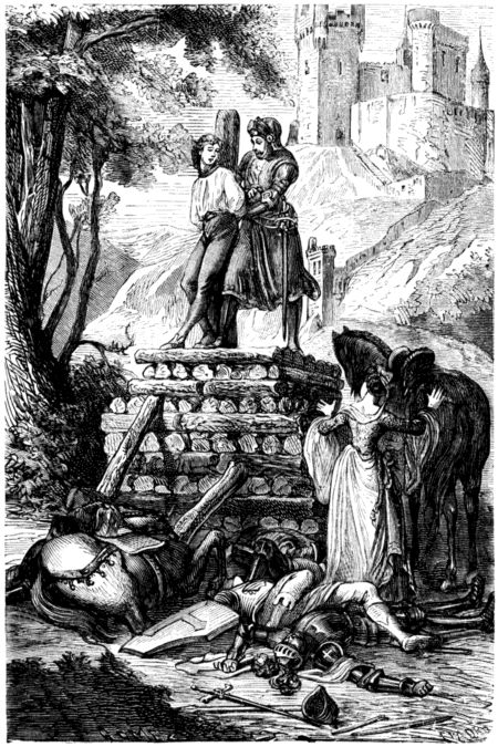 Siguiendo, pues, su marcha, llegaron á la caida de la tarde á una ciudad situada en medio de la Francia, la cual estaba en poder del rey Marsilio, quien la habia conquistado en aquella guerra. No se detuvieron en el puente ni en las puertas; pues aun cuando en torno del rastrillo y de los fosos se veia un gran número de soldados y de aprestos beli[7]cosos, nadie les estorbó el paso. Como los soldados conocian á la dama que iba en compañía de Rugiero, le dejaron pasar libremente, sin preguntarle siquiera de donde venia. Llegó á la plaza, encontrándola llena de una multitud cruel, apiñada en derredor de una siniestra pira, sobre la cual divisó pálido y macilento al jóven condenado á perecer entre sus llamas.