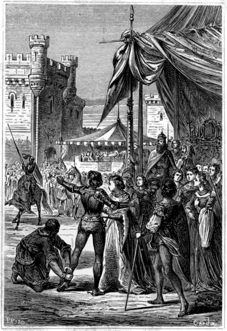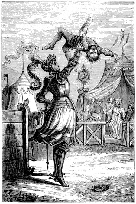 —¿Hay alguno de vosotros, dijo, que quiera probar si vale más que yo, peleando á lanza ó espada, hasta que uno de los dos, firme en la silla, arroje de la suya á su adversario?