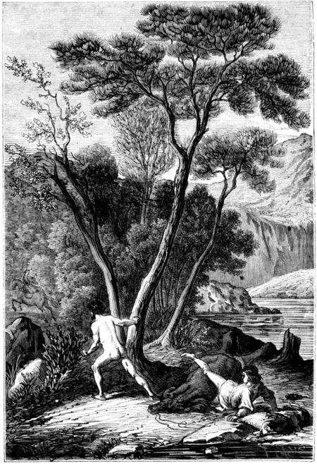 Llegaron en el mismo dia al sitio en que debian ser vendidos los dos hermanos: era una vasta llanura, abrasada [26] por los ardientes rayos del Sol: no se descubrian en ella mirtos, laureles, cipreses, fresnos ni hayas: tan solo se veian plantas raquíticas ó alguno que otro humilde arbusto, jamás molestado por el azadon ó por el arado. Los tres audaces guerreros hicieron alto en un sendero que atravesaba la llanura y vieron venir hácia ellos un caballero, que llevaba una armadura con adornos de oro, y por enseña, en campo verde, el ave hermosa y peregrina que vive más de un siglo. Pero basta ya, Señor; que he llegado al final de este canto, y necesito descansar algunos momentos.