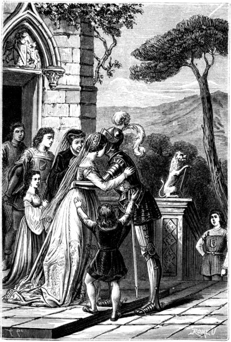 »Pasó la noche, y Febo sacó del seno de las ondas su blonda cabellera, iluminando el mundo. En cuanto apareció el dia y dejaron ambas el lecho, sintió Flor-de-Espina aumentarse su dolor; pues Bradamante, que anhelaba salir de tan embarazosa situacion, manifestó que debia ausentarse. La bella princesa quiso que se llevara en memoria suya un magnífico corcel, enjaezado con franjas de oro, y además una sobrevesta ricamente tejida por sus propias manos. Despues de haberla acompañado hasta una larga distancia, regresó á su palacio, derramando copiosas lágrimas.