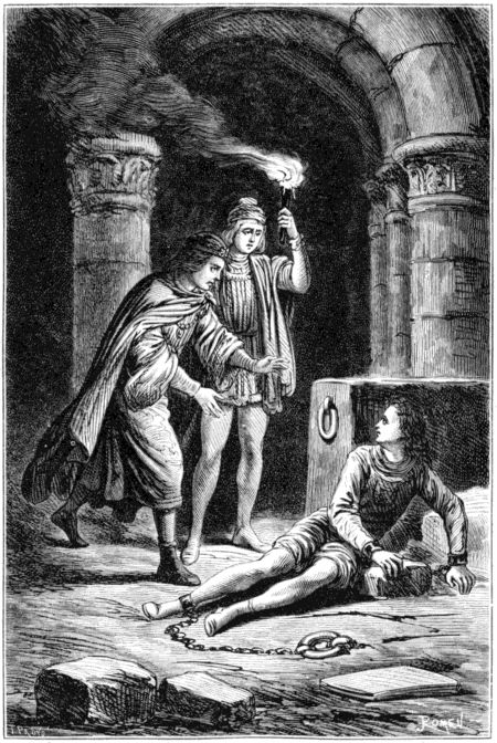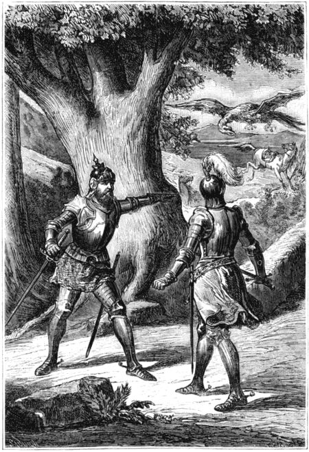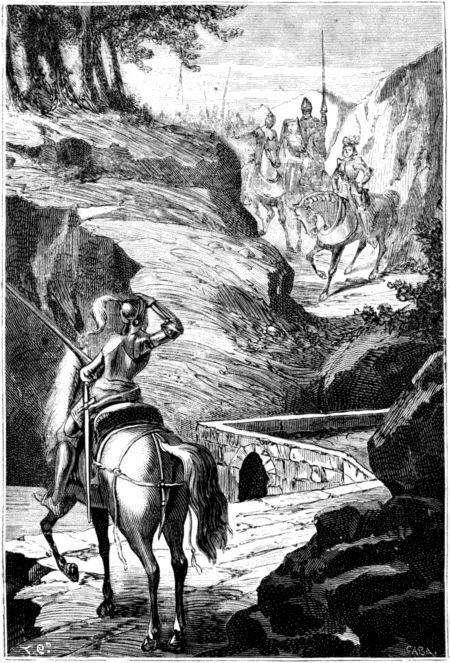 —Aceptando tu reto, contestó Aldigiero, cruzaria de buena gana la espada contigo ó romperia una lanza, si no fuera porque estamos preparados para llevar á cabo otra empresa, de la cual podrás ser testigo si te detienes un momento; y esta empresa reclama en tan alto grado nuestra atencion, que apenas nos da tiempo, no ya para luchar contigo, sino ni siquiera para dirigirte la palabra. Estamos esperando seiscientos hombres ó quizá más, con los cuales hemos de medir nuestras fuerzas, á fin de arrancar de sus manos á dos hermanos nuestros, á quienes traerán cargados de cadenas por este mismo sitio. El cariño fraternal y la compasion nos darán el valor que necesitamos.