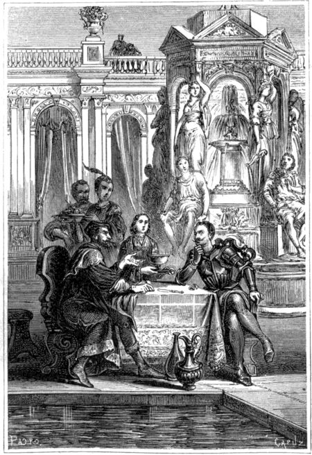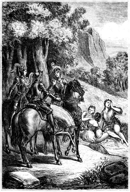 [6] Habiendo convenido los dos caballeros paganos en diferir sus querellas, se dirigieron juntamente con Doralicia hácia Paris para salvar al ejército africano: con ellos iba tambien el diminuto enano que habia ido siguiendo las huellas del Tártaro, hasta conseguir que el celoso Rodomonte le alcanzara. Llegaron á un prado, donde estaban descansando á orillas de un arroyo dos caballeros desarmados, y otros dos cubiertos con los yelmos, acompañando á una dama de bello rostro. En otra parte os diré quiénes eran estos personajes; pues antes es preciso que vuelva á hablaros del buen Rugiero, á quien dejé en el momento en que arrojaba su escudo en un pozo.
