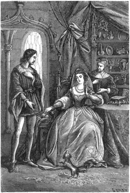 »Oculto entre ambos el secreto de nuestro amor, disfrutamos de sus placeres por espacio de algun tiempo; mas no faltó quien lo descubriera, y hasta llegó á oidos del Rey, por mi desgracia. Vos, señor, que me habeis arrancado de las manos de los que encendieron la hoguera en la plaza, comprendereis fácilmente el resto; pero solo Dios conoce el desconsuelo en que he quedado.»