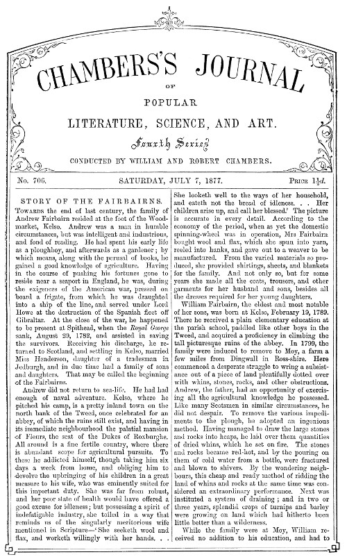 Towards the end of last century, the family of Andrew Fairbairn resided at the foot of the Woodmarket, Kelso. Andrew was a man in humble circumstances, but was intelligent and industrious, and fond of reading. He had spent his early life as a ploughboy, and afterwards as a gardener; by which means, along with the perusal of books, he gained a good knowledge of agriculture. Having in the course of pushing his fortunes gone to reside near a seaport in England, he was, during the exigences of the American war, pressed on board a frigate, from which he was draughted into a ship of the line, and served under Lord Howe at the destruction of the Spanish fleet off Gibraltar. At the close of the war, he happened to be present at Spithead, when the Royal George sank, August 29, 1782, and assisted in saving the survivors. Receiving his discharge, he returned to Scotland, and settling in Kelso, married Miss Henderson, daughter of a tradesman in Jedburgh, and in due time had a family of sons and daughters. That may be called the beginning of the Fairbairns.