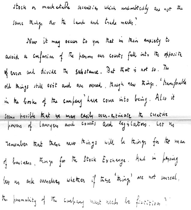 Now it may occur to you that in their anxiety to avoid a confusion of the persons our courts fall into the opposite of error and divide the substance. But that is not so. The old things still exist and are owned, though new things 'transferable in the books of the company' have come into being. Also it seems possible that we may easily over-estimate the creative powers of lawyers and courts and legislators. Let us remember that these new things will be things for the man of business, things for the Stock Exchange. And in passing let us ask ourselves whether if these 'things' are not unreal, the personality of the company must needs be fictitious?