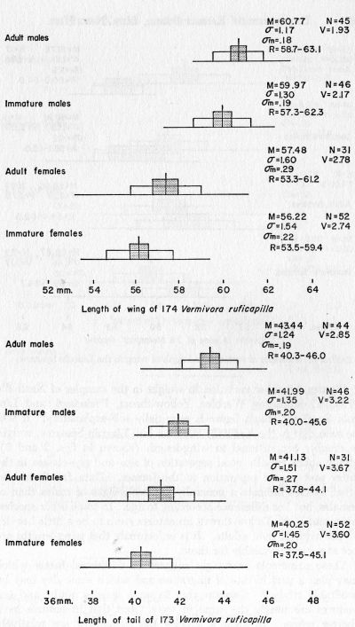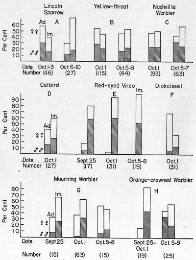 In spite of the great potential of this kind of material, the majority of ornithologists with access to such data have contented themselves with listing the species and sometimes the numbers of birds killed. A few have gone further. James T. Tanner (unpublished) attempted to compute the longevity of the Ovenbird (Seiurus aurocapillus) by analysis of ceilometer-killed birds at Knoxville, Tennessee (see below). Mention should be made of the reports of Rintoul and Baxter (1914) supplemented by Ticehurst (1916) who used rather small numbers of birds killed at Scottish lighthouses in studies of molt. However, the only effort to utilize the results of accidental kills on a large scale over a period of years appears to have been that, already mentioned, of Barrington (1900) and his co-workers in Ireland. An idea of the potentialities of the large recent kills in the United States may be obtained when it is recalled that in the 18 years of Barrington's work, which embodied some 1000 reports from lighthouse keepers, Barrington obtained for study only about 2000 specimens, many of these consisting of wings and feet only (Barrington's paper not seen in original; see J. A. Allen, 1901:205). More recently Dobben and Bruyns (1939) have analyzed the age and sex classes of some birds killed at lighthouses in Holland.