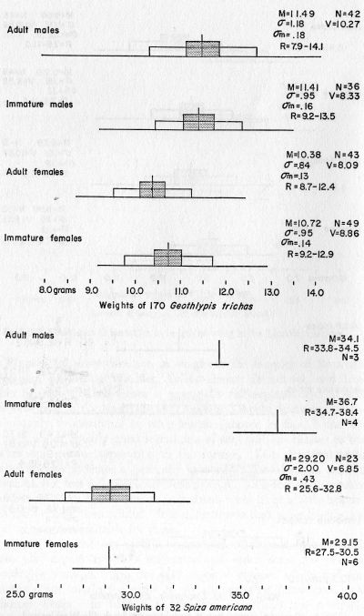 While conservation-minded individuals have been concerned with the tremendous mortality involved in these various events, the ill wind blows some good in that, properly used, the data provided by such accidents can shed light on many obscure aspects of bird migration. Each accidental kill of birds affords a cross-section, approaching in variable degree a random sample, of the migrants passing a given point on a given date. The types of information provided by such kills are numerous, for example: (1) information on the presence of various species and the dates of their occurrence; (2) information on the relative abundance of species; (3) quantitative data on the relative sizes of males and females, and immatures and adults (of importance to taxonomic ornithology); (4) information on the relative times of migration of males, females, adults, and young; (5) information on molts and plumages; (6) quantitative information on composition by subspecies of migrants of the same species; (7) physiological data (fat condition, etc.) pertinent to the study of migration; and probably others.