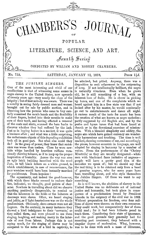 The equanimity, and indeed the good-humour, with which these blacks seemed to endure their fate, indicated, we thought, good points of character. Nowhere in travelling about did we observe anything positively disagreeable, to remind us that the labourers in the fields or the loiterers at doorways were slaves. Often, we heard singing and jollity, as if light-heartedness was on the whole predominant. Obviously, slave-owners were not all Legrees. On the contrary, in many instances they shewed a kind indulgence to their ‘servants,’ as they called them, and were pleased to see them singing, laughing, and making merry in the intervals of rest from labour. Perhaps this is not saying much, for the singing of slaves may be compared to the notes of a bird in captivity, to be admired, but pitied. Anyway, there was a disposition to seek solacement in the outpouring of song. If not intellectually brilliant, the negro is naturally vivacious. Even when he grows old, he is still something of a boy, with an inherent love of frolic. He is clever in picking up tunes, and one of the complaints which we heard against him in a free state was that if not looked after by his master, he would continually go out to entertainments and dance all night. A curious result of the taste for music has been the creation of what are known as negro melodies; partly suggested by old English airs, and by the psalm and hymn tunes that had been heard at church or in the devotional exercises of missionaries. With a blended simplicity and oddity, the negro airs which have gained currency are wonderfully harmonious and touching. The time is well marked, shewing correctness of ear, and accordingly the pieces, however eccentric in language, are well adapted for singing in harmony by a number of voices. From the performances of the ‘Christy Minstrels,’ as they are usually designated—white men with blackened faces imitative of negroes—people will have a pretty good idea of the melodies we speak of; but we should say that the real thing is to be obtained only from a band of genuine negroes, who for some years have been travelling about, and who style themselves the Jubilee Singers. Of these we want to say something.