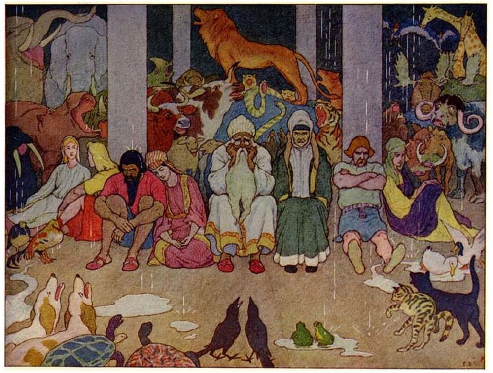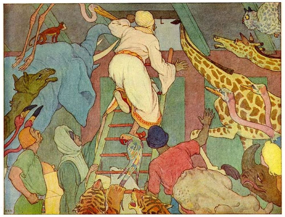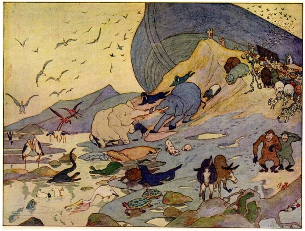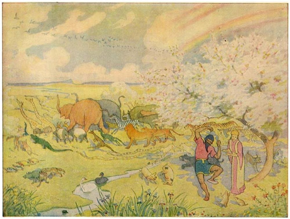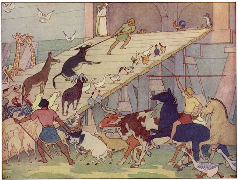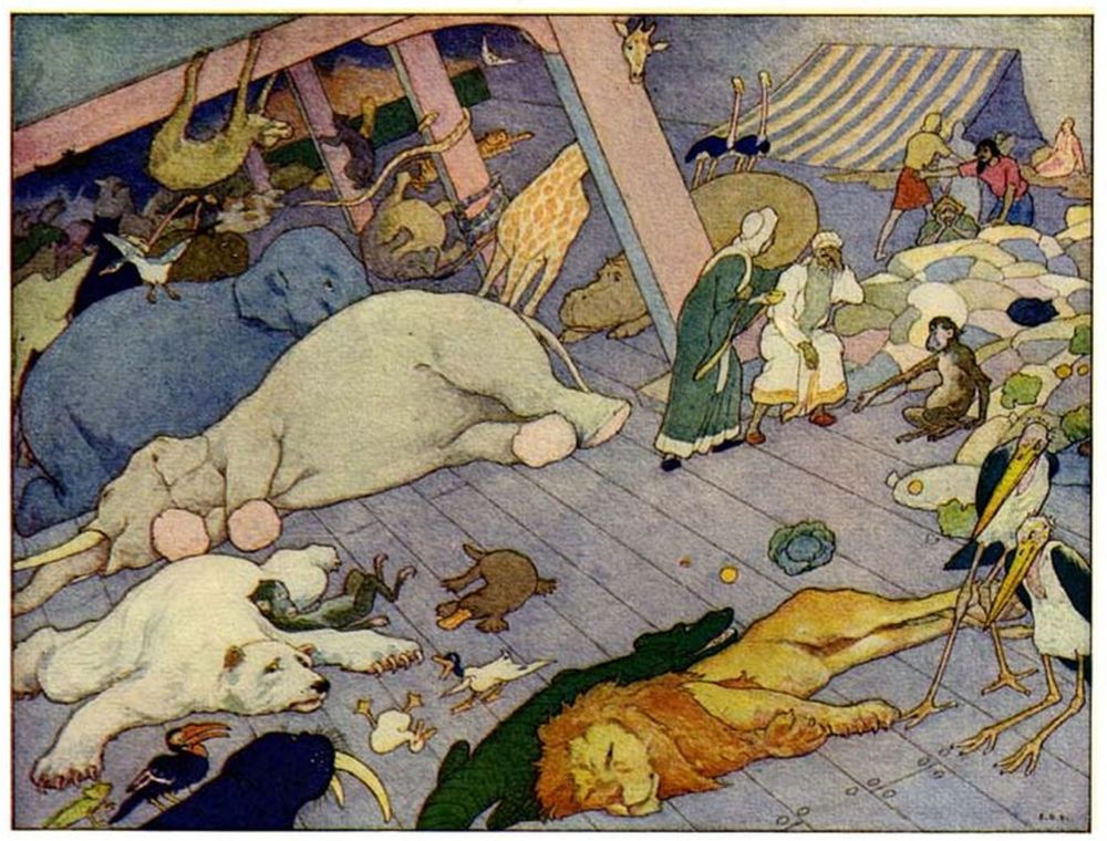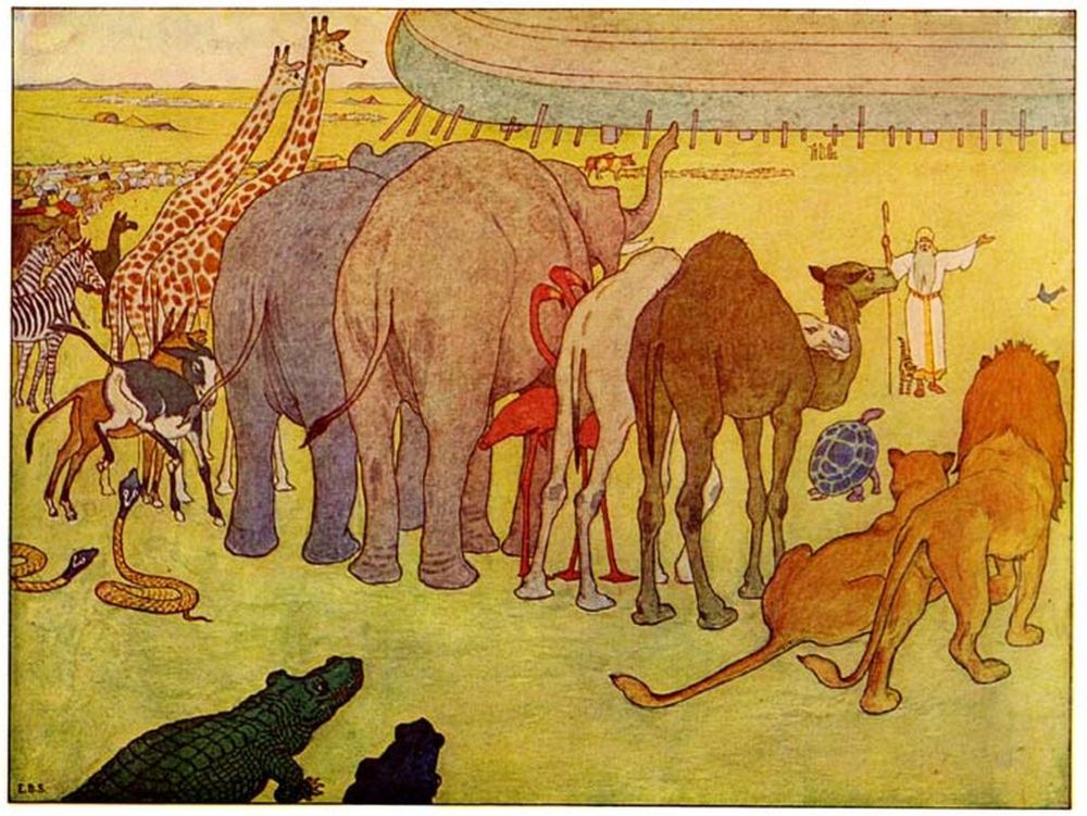 Then Noah went abroad and called together all the animals, by twos, and told them that they must come into the Ark to be saved from the deluge.