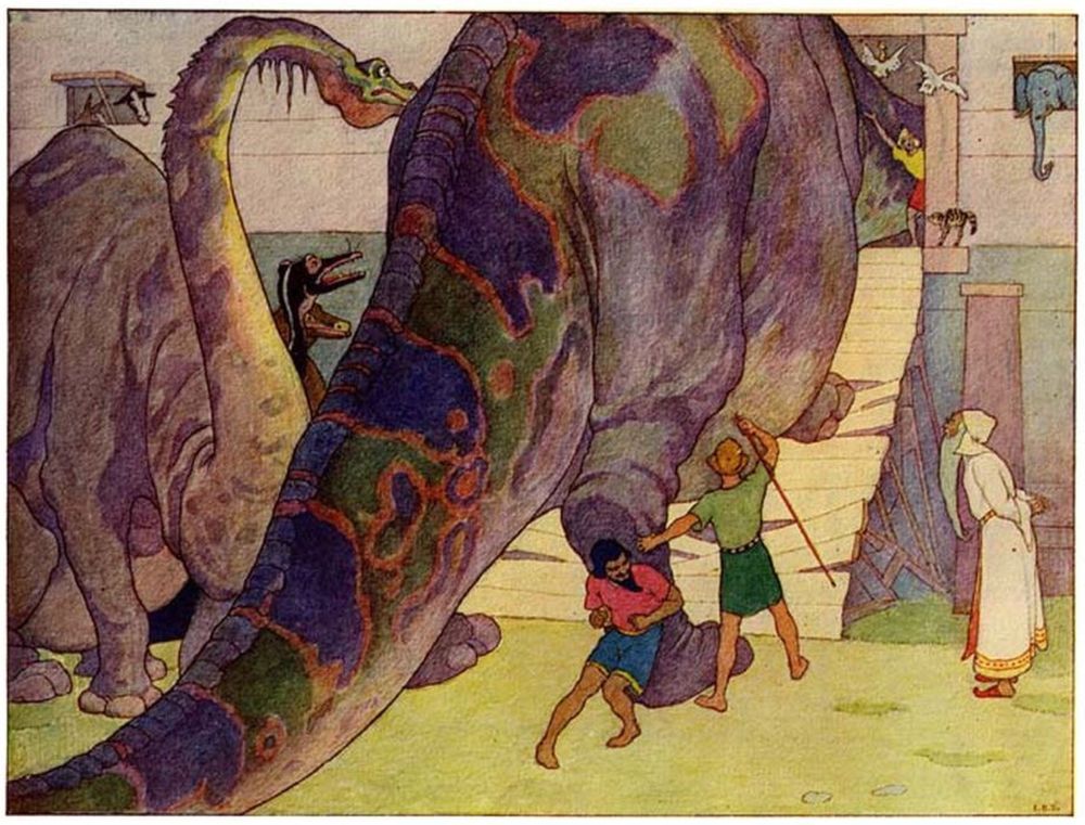 And then came even the huge dinosaurs, for in those days were mighty beasts. But they were too big for the door, and could not squeeze in.