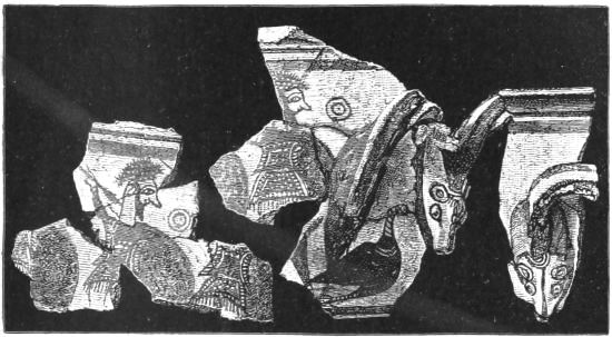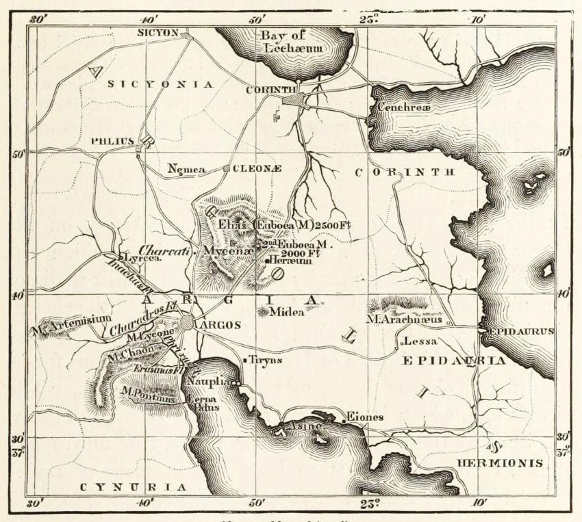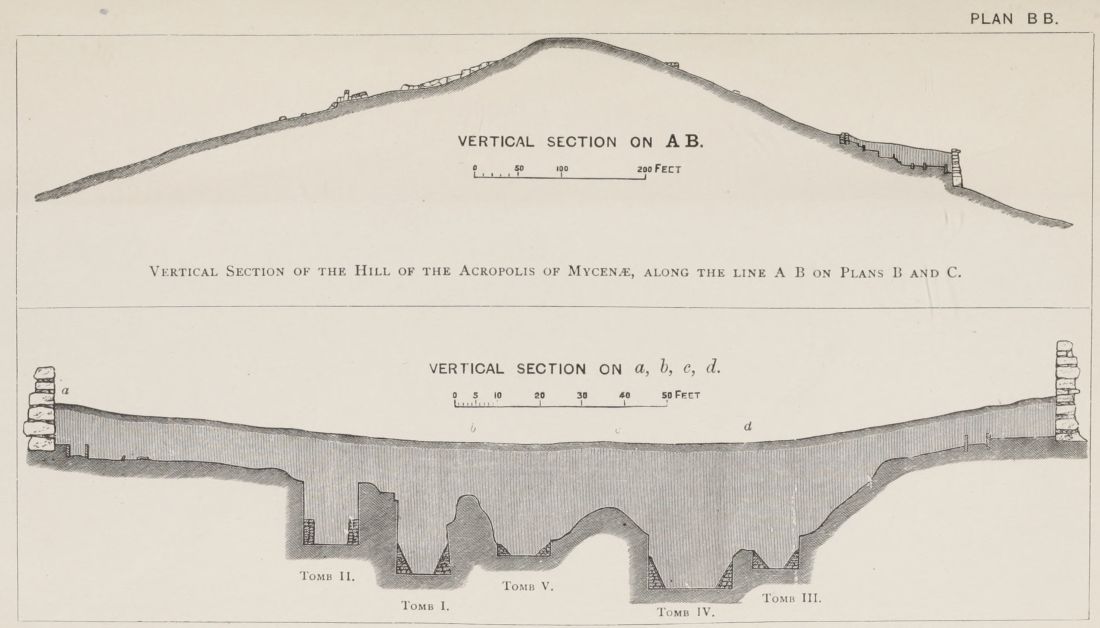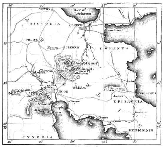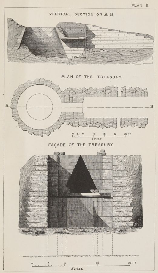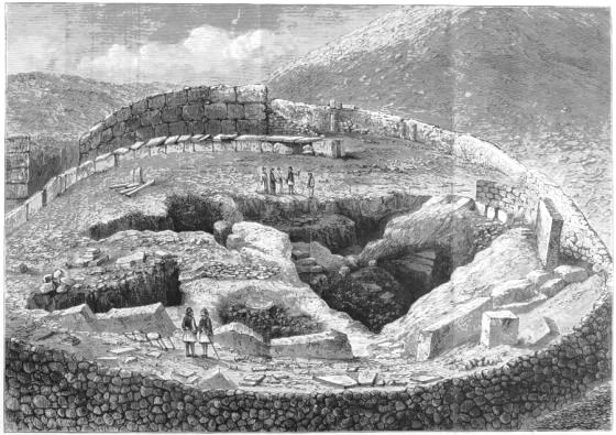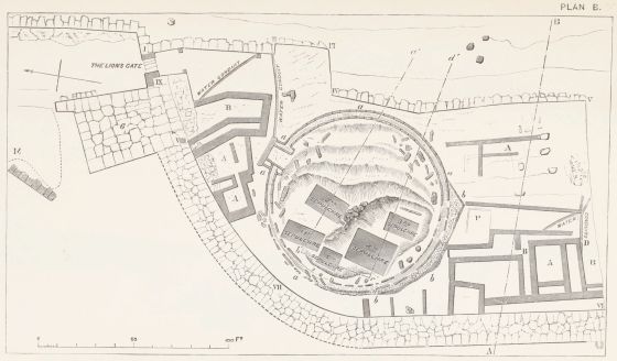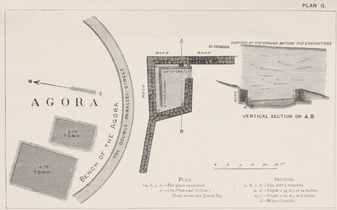 6. We have at Mycenæ the Agora, or place of Assembly, in full agreement with the Poems on the two points, first of its circular form (pp. 338, 339), and secondly of the smoothed horizontal slabs, bounding the circle, on which the Elders sate. I do not dilate upon these, as they are fully noticed in the text: but I shall return to the subject, in connection with the situation chosen for the tombs, and the inferences which are to be drawn from this important circumstance.