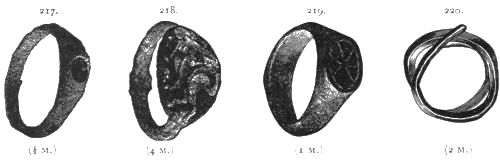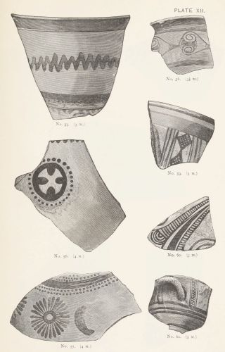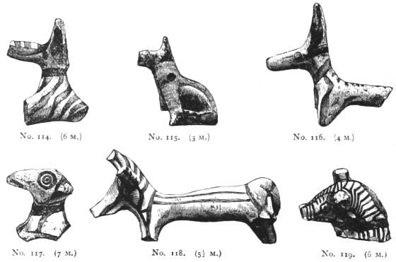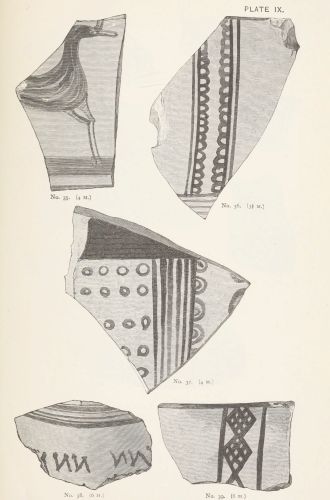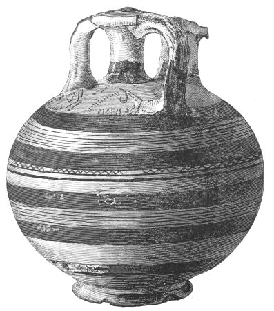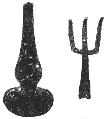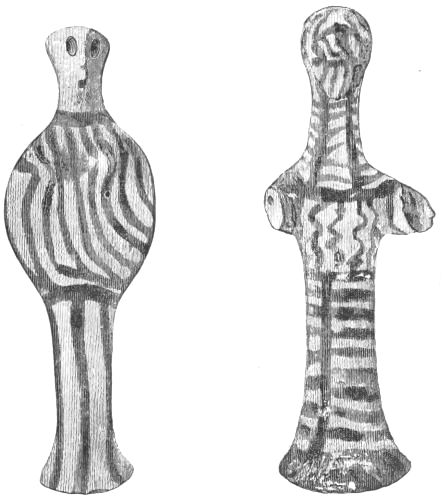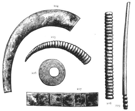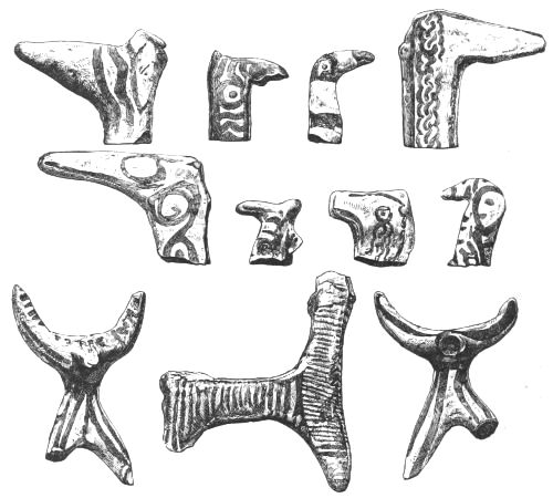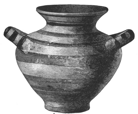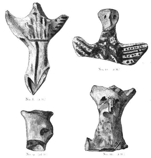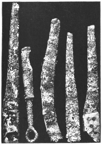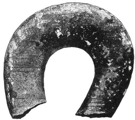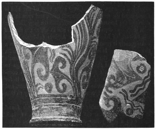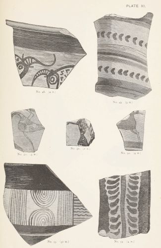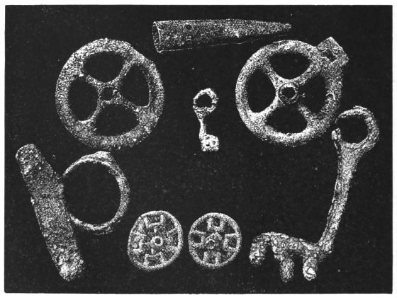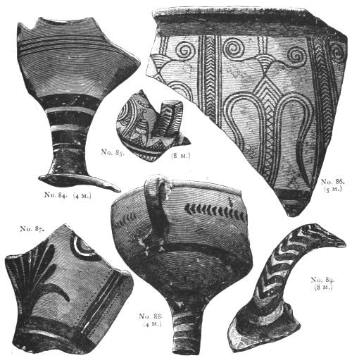 4. Passing from architectural to moveable objects, I observe that Dr. Schliemann found both knives and keys of iron in Mycenæ, but that from their form he assigns them to a later and strictly historic period. Old Mycenæ, therefore, in accordance with Hissarlik, has afforded us, up to the present time, no remains of this metal. In the Poems it is freely mentioned, but as a rare and valuable substance, used where great hardness was required, and for objects comparatively small and portable; except, indeed, in the case of the Gates of Tartaros (Il. VIII 15), where the Poet could dispose of as much material as he pleased. The aggregate quantity, then, was small; and the instruments were likely to be carried away on the abandonment or destruction of a city. Its absence may therefore be accounted for, in part by its value, but also, and more[xi] especially, because it so readily corrodes.[3] Therefore, although we cannot here establish a positive correspondence, neither have we any occasion to admit a discrepancy.