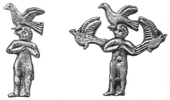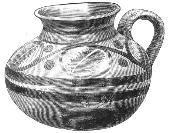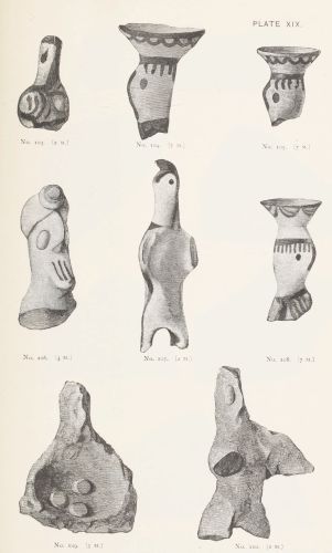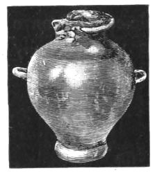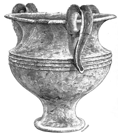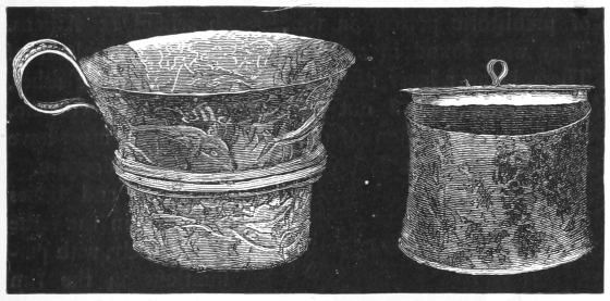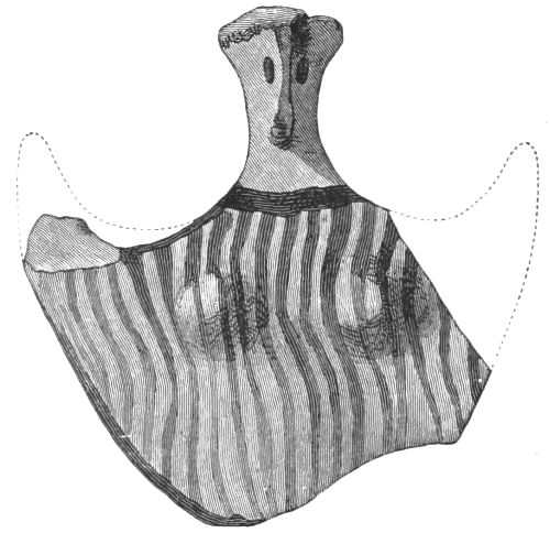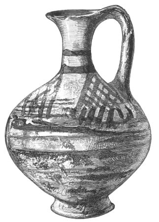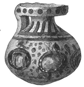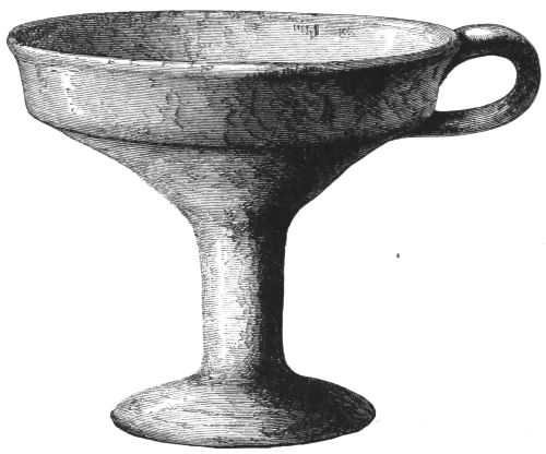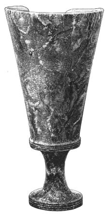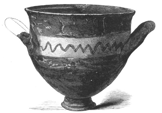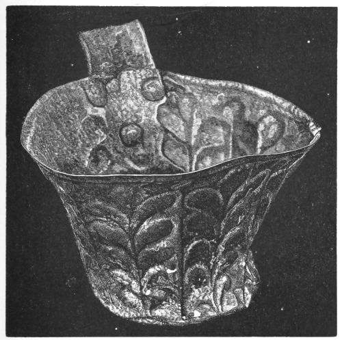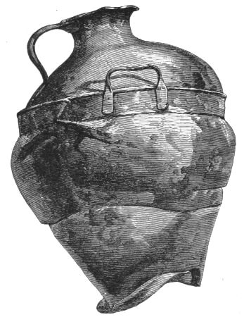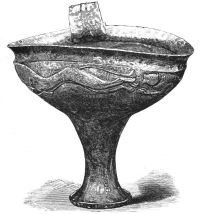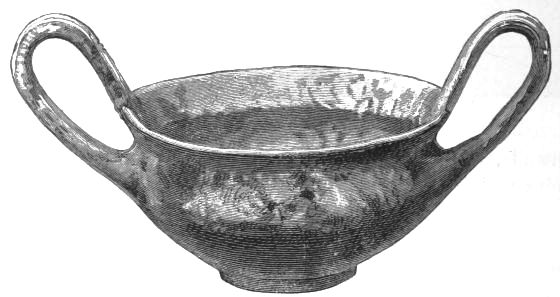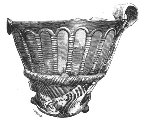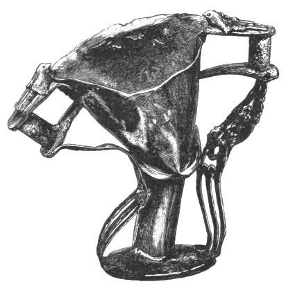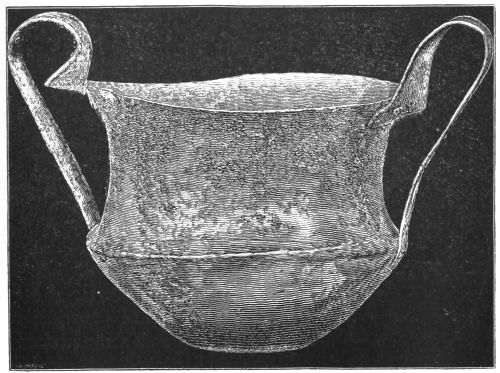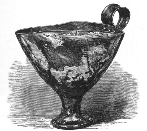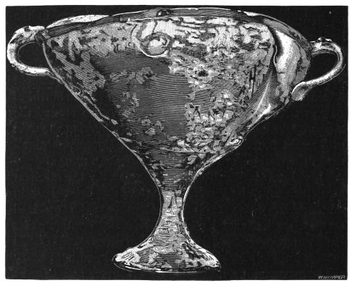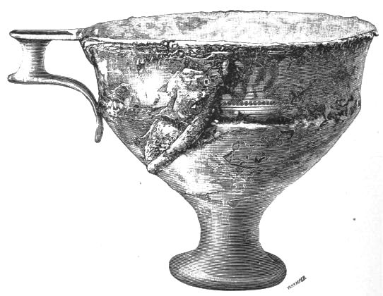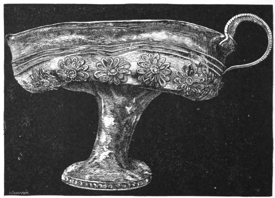 5. The goblet (No. 346 of the volume) has on each of its two handles, we are told, the carved figure of a dove in gold. Schliemann observes on the correspondence with the goblet of Nestor (Il. XI. 632-635). We are not indeed[xxiv] told that this was of gold; probably a different material is to be supposed from the mention of gold as the material of these parts or appendages. But it had four handles, and on each handle were two doves. We are also told that he did not get it in Troy, which may remind us of the argument already presented, but brought it from home. It was probably a foreign work; for the Phœnician associations of Nestor are attested by his descent from Poseidon (Od. XI. 254). This is fairly to be noted for an instance of equable development in art, as between the discoveries and the Poems.