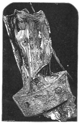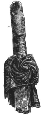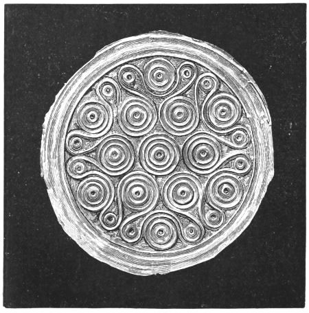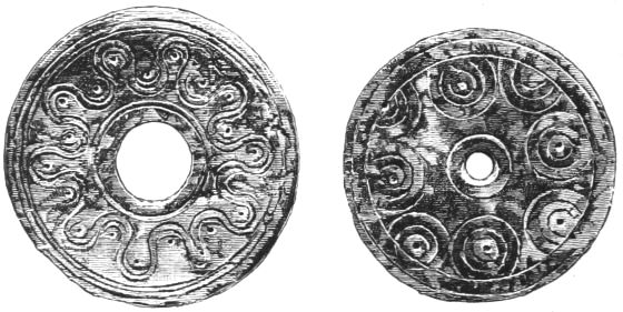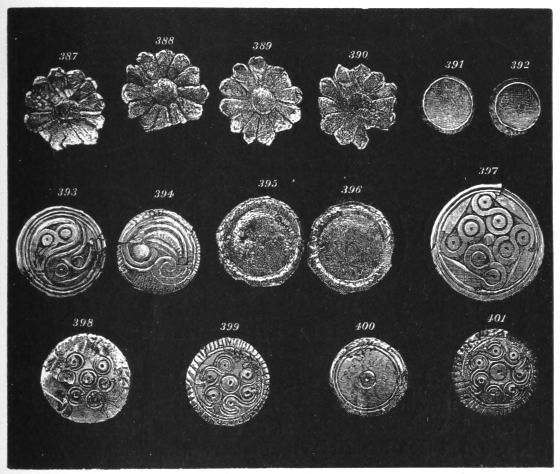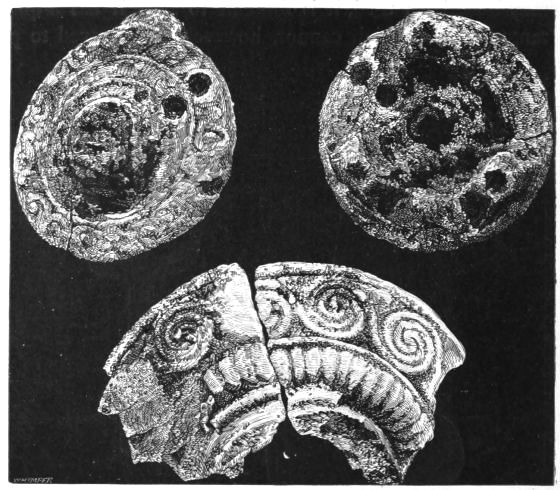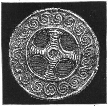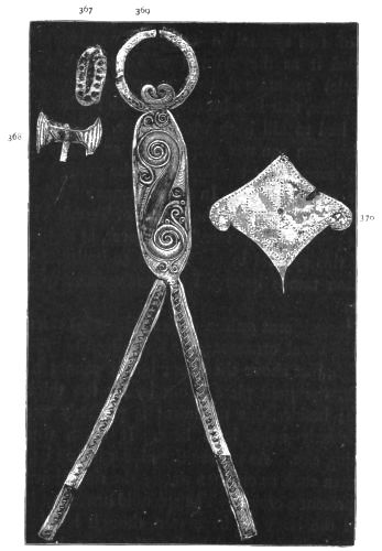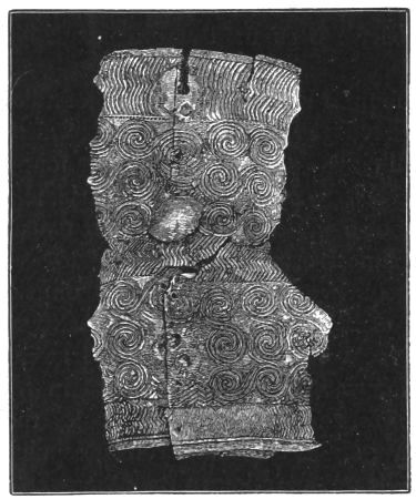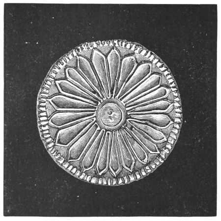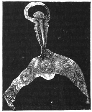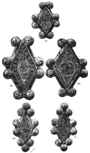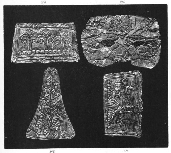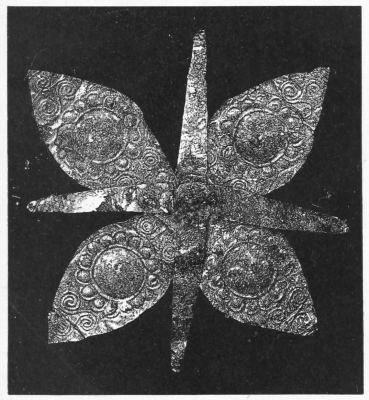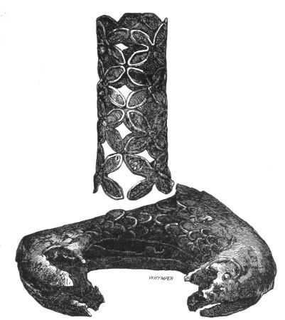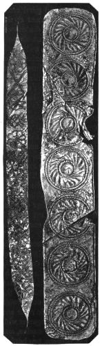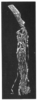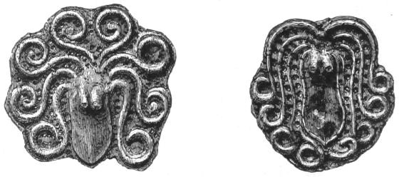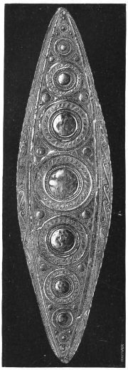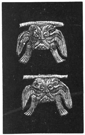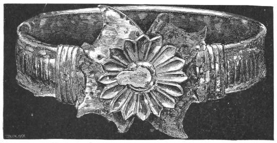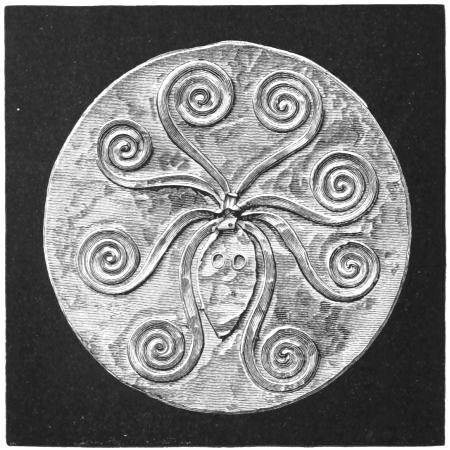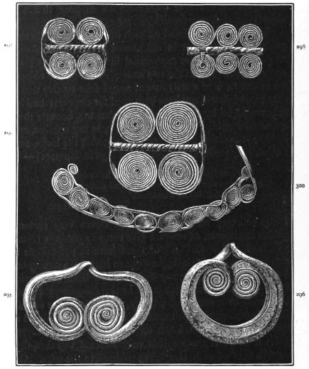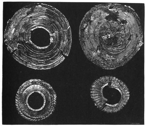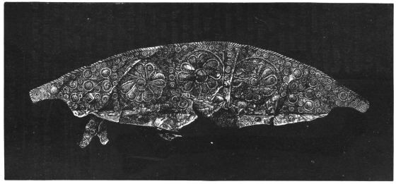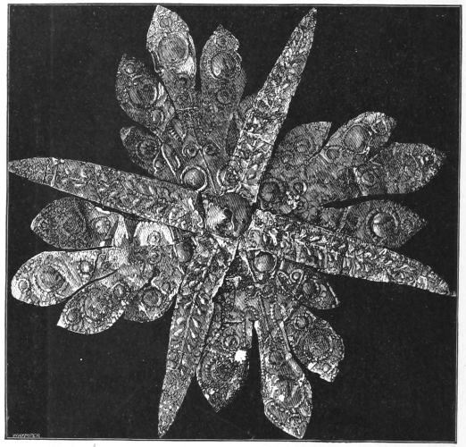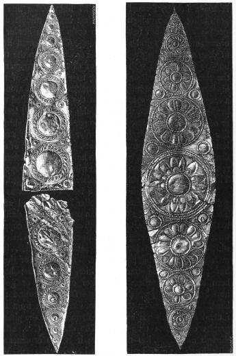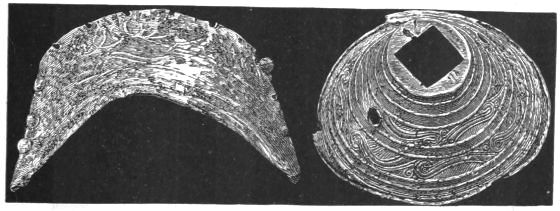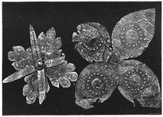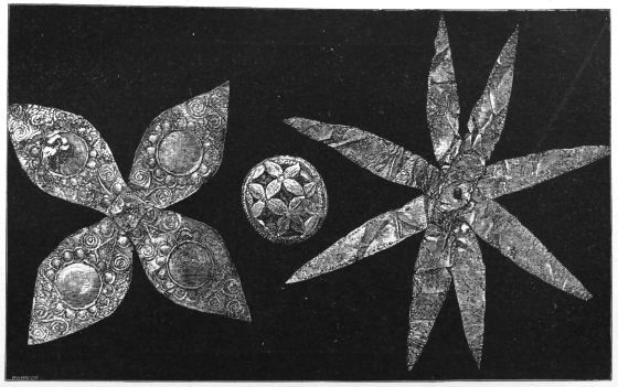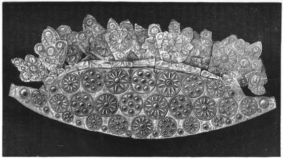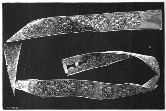 2. The most remarkable, perhaps, in themselves, of all the objects discovered at Hissarlik, were the two elaborate head-dresses of gold, which for the first time enabled us to construe, with reasonable confidence, the entire passage in the Iliad (XXII. 468-72), which describes the head-dress cast away by Andromachè in the agony of her grief. The print will not have been forgotten, which exhibits the plektè anadesmè.[9] It was a series of gold plaits, hanging down, over the forehead and the ears, from the broad band (ampūx) which ran round the head, and which constituted as it were the base of the ornament. With these objects, and with the Poems, Schliemann associates, incontestably as it would appear, the ornament No. 357 (p. 248); a band or frontlet adorned "with rosettes and crosses. It has two perforations in the rim, a little way from either end, from one of which is still hanging the fragment of a very fine chain." The only variation in the fashion of the thing seems to be, that the plaits have not been continued over the forehead.