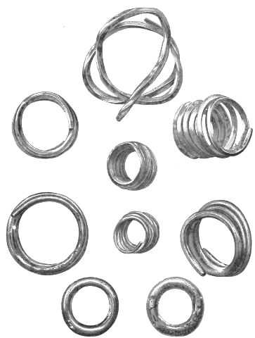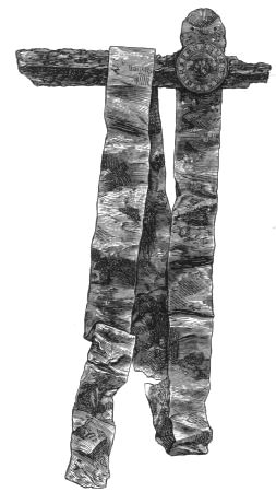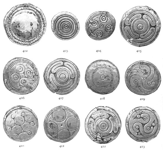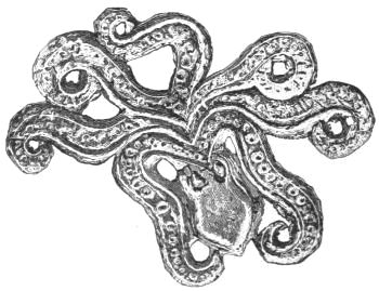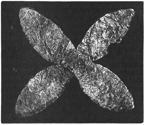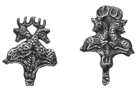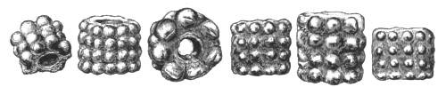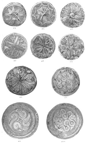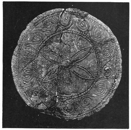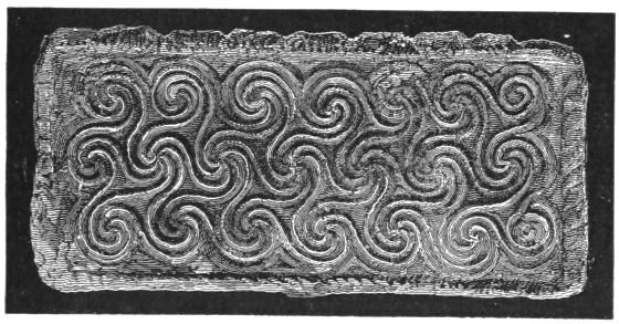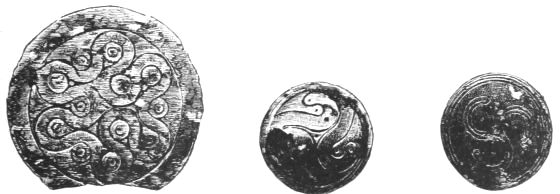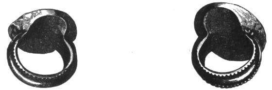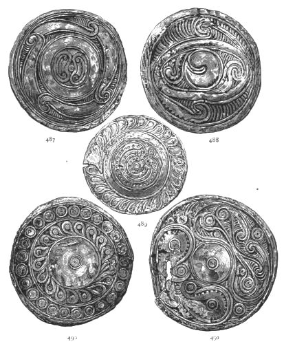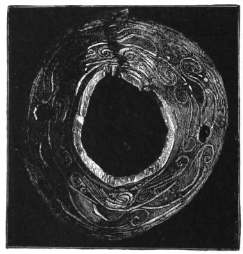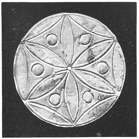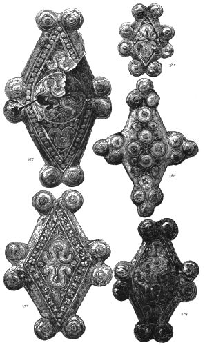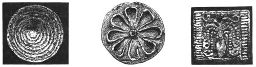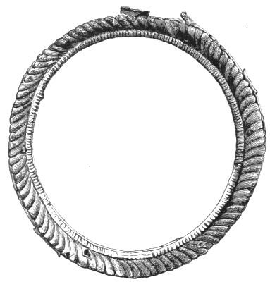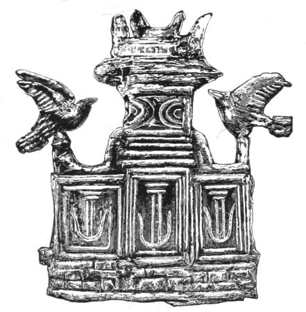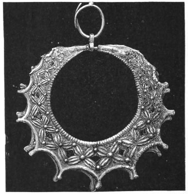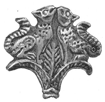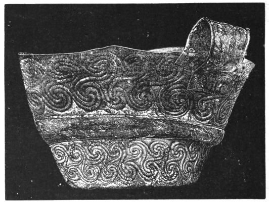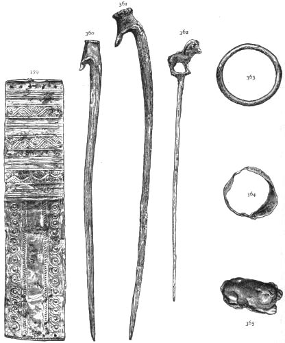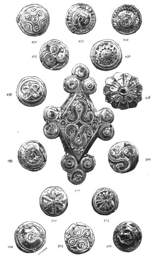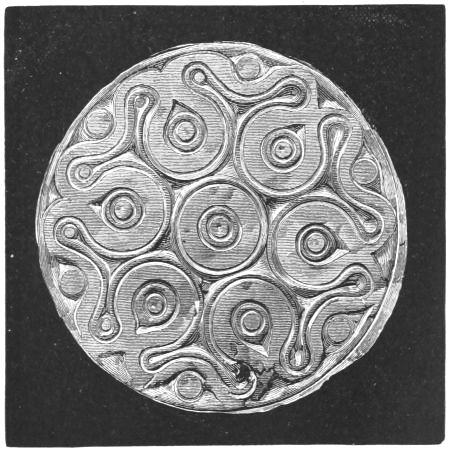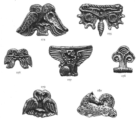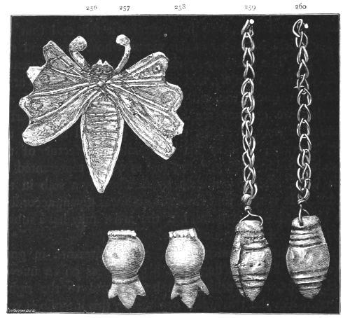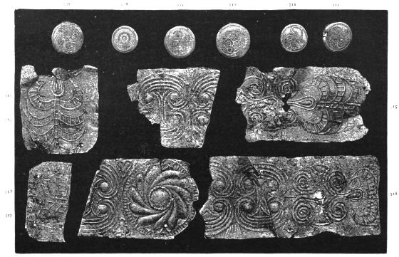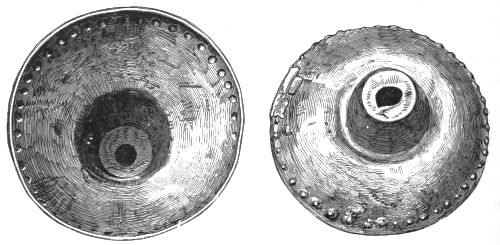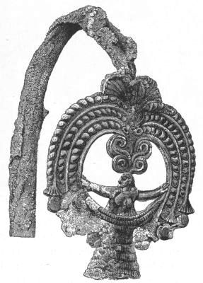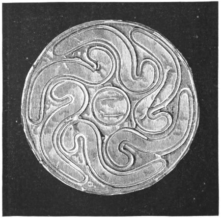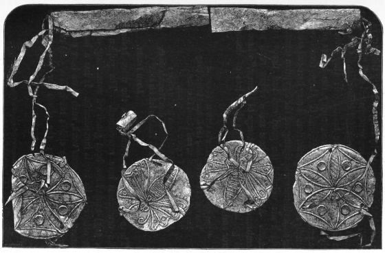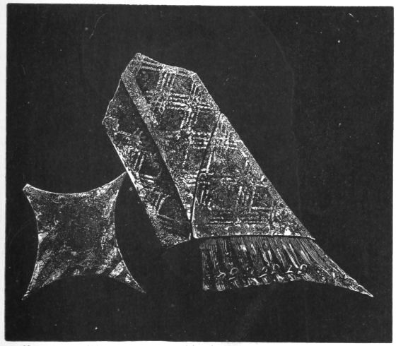 2. The most remarkable, perhaps, in themselves, of all the objects discovered at Hissarlik, were the two elaborate head-dresses of gold, which for the first time enabled us to construe, with reasonable confidence, the entire passage in the Iliad (XXII. 468-72), which describes the head-dress cast away by Andromachè in the agony of her grief. The print will not have been forgotten, which exhibits the plektè anadesmè.[9] It was a series of gold plaits, hanging down, over the forehead and the ears, from the broad band (ampūx) which ran round the head, and which constituted as it were the base of the ornament. With these objects, and with the Poems, Schliemann associates, incontestably as it would appear, the ornament No. 357 (p. 248); a band or frontlet adorned "with rosettes and crosses. It has two perforations in the rim, a little way from either end, from one of which is still hanging the fragment of a very fine chain." The only variation in the fashion of the thing seems to be, that the plaits have not been continued over the forehead.