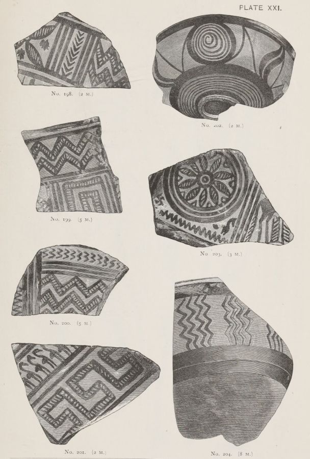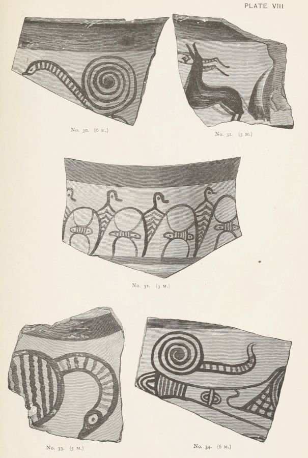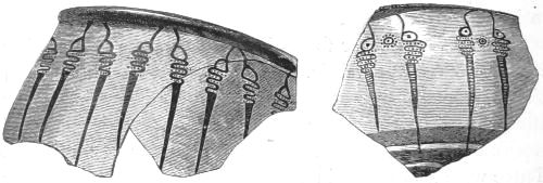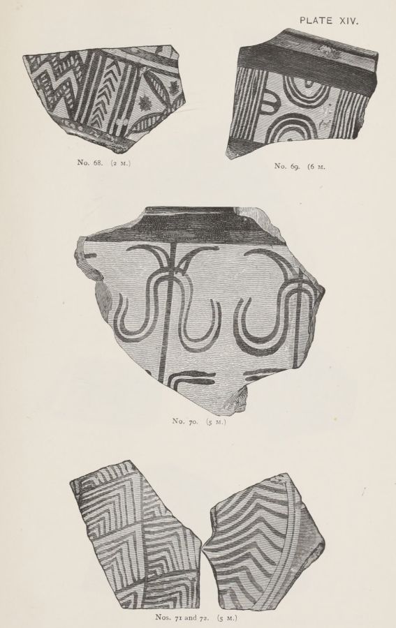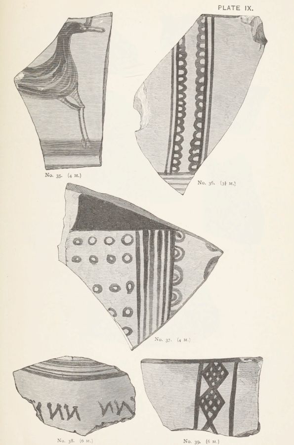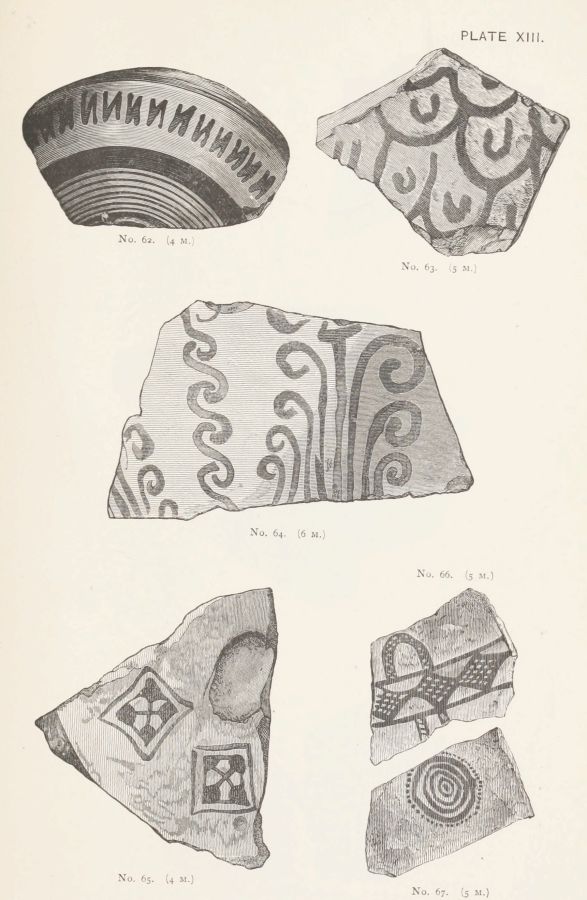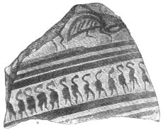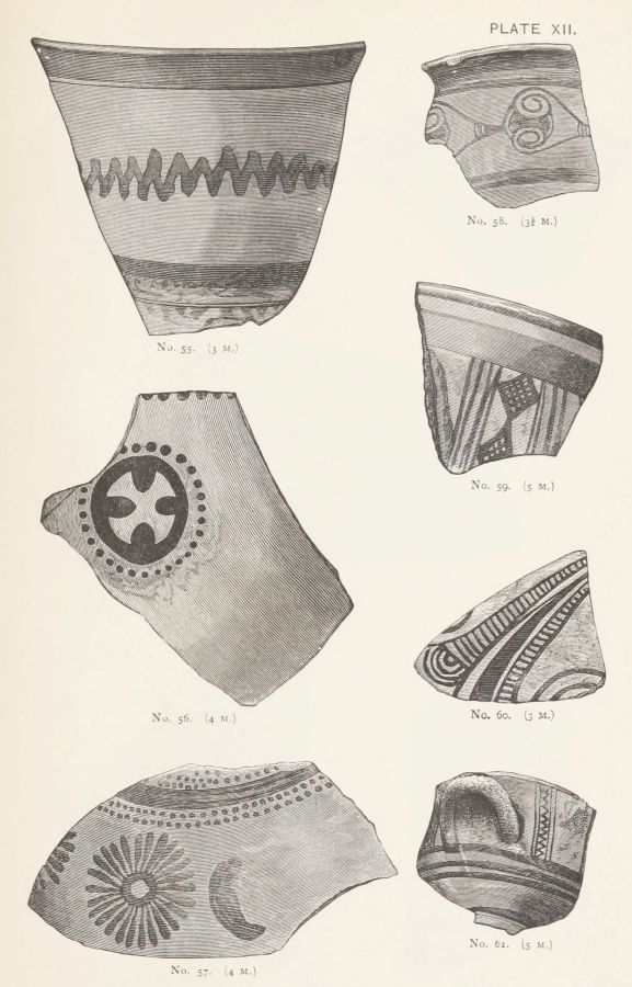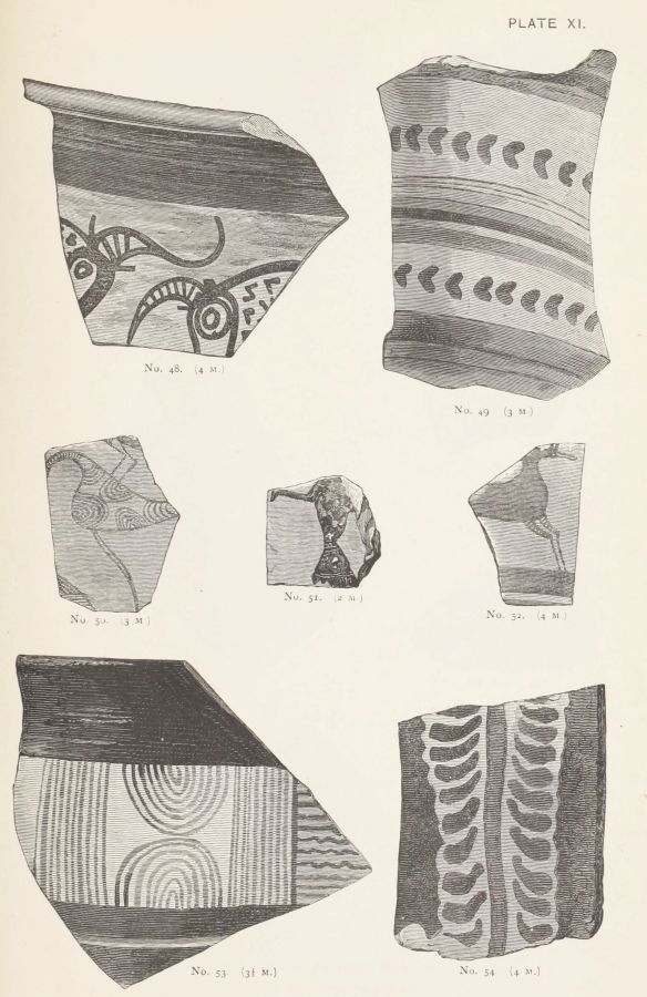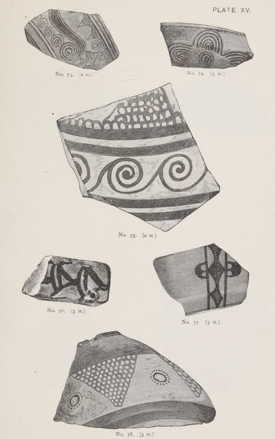 I gather from Mr. Gardner's report that the Art exhibited on the Pottery is more uniformly backward, than that exhibited by the works of metal. But this pottery, which was, whether wheel made or hand-made, of an early stage in the manufacture, was far more likely to be domestic; while the works in the precious metals might be imported. Or they might be the productions of foreign artists, attracted to the Court of Agamemnon; in the same manner as we find that Daidalos, whose name, however mythical, represents a foreign influence, executed in Crete, for Ariadne, the representation of a dance in metal.