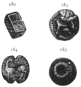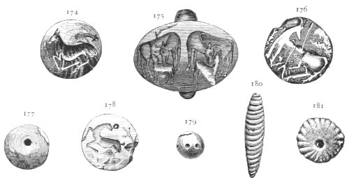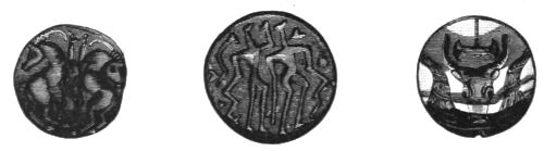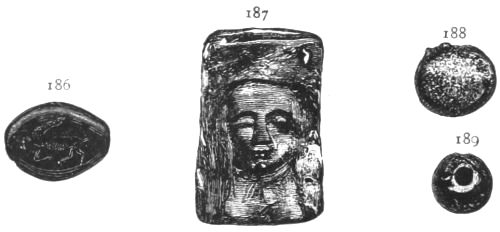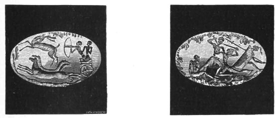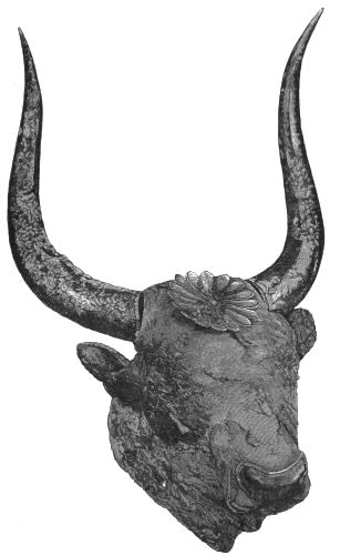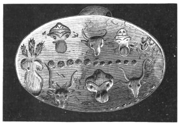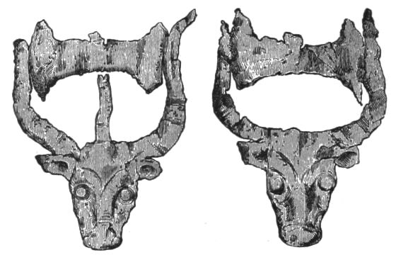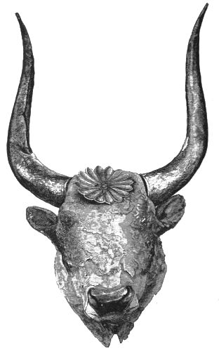 1. He presents to us the rude figures of cows; and[vii] upon a signet ring (No. 531) and elsewhere, cow-heads not to be mistaken. He then points to the traditional worship, from the first, of Hera in Argolis; and he asks us to connect these facts with the use of Boöpis (cow-eyed) as a staple epithet of this goddess in the Poems; and he might add, with her special guardianship of Agamemnon in his interests and his personal safety (Il. I. 194-222).