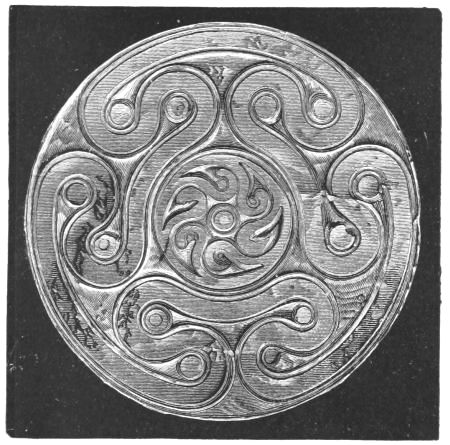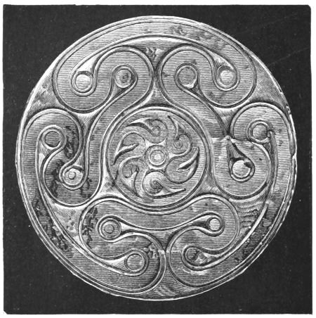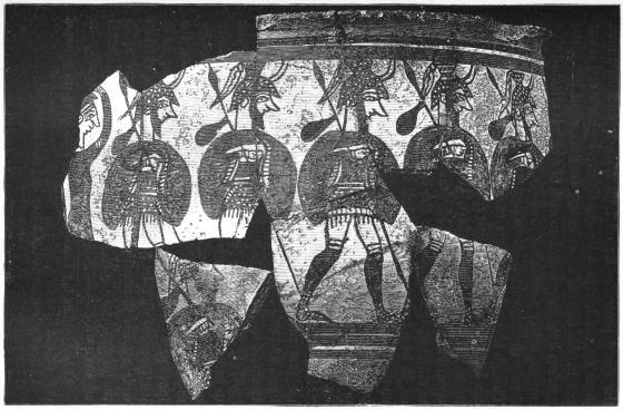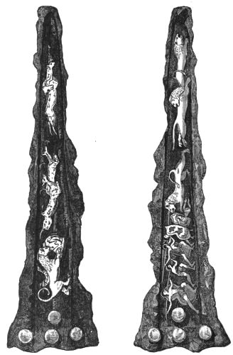 The discovery, or the inspection, of the works must without doubt in the first instance suggest a reference of them to a local school of goldsmiths. But, considering the numerous points of contact between the discoveries and the Homeric Poems, it is important to know whether, and how far, they really favour such a supposition. This is not the place for an examination in detail of all the works of Art mentioned by Homer. I believe there is no one of them, of which the purely Greek origin can be esta[xiii]blished by proof from the text, while the manufacture abroad and importation are frequently mentioned. At the same time, there are some considerations which tend to show that, if there were local workmen in Greece capable of producing objects such as those now exhumed, it is at Mycenæ that we should expect to find them. First, on account of the wealth of the city, and of its position as the capital of the country. Secondly, on account of the wealth of Agamemnon personally, and his acquisitiveness if not his avarice, which made him eager to spoil those whom his spear had slain, and which is the subject of varied allusions in the Iliad. It must be remembered that in those days works of art were not merely ornamental, but were a favourite form, as their name (keimelia) shows, of stored wealth: and of these, even in Troas, Agamemnon possessed many (Il. IX. 330). Thirdly, an indication, perhaps, more significant, may be drawn from the remarkable passage in the Eleventh Book (15-46), which describes the arming of Agamemnon for the field. The first portion of the armour, that attracts observation, is an elaborately wrought breast-plate, which had come from Cyprus, a seat of Phœnician settlement. We next come to the sword, which I shall presently describe. This is followed by the shield, adorned with many bosses of metal, but also carrying a representation of the Gorgon with the heads or figures of Fear and Panic. This shield must be considered as a work of art; and the same may be said of its band or strap, which carried the figure of a three-headed snake. There is nothing said to connect these works with foreign manufacture. The family of Agamemnon was of a foreign origin comparatively recent; but it may remain an open question, whether these arms are presumptively referable, or not, to a domestic manufacture.
