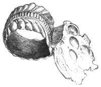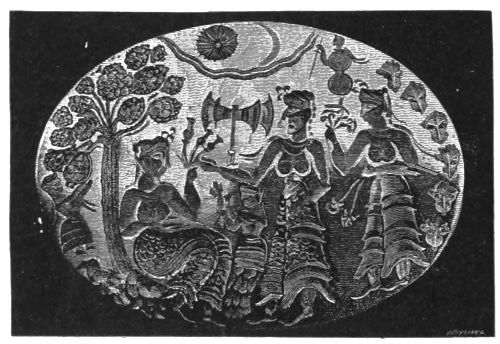 I turn, then, to Dr. Schliemann's volume, and call attention to the signet ring at p. 354, which, though apparently not of a high order in art, combines so many objects of interest. On the extreme left of the picture stands a child, or small woman, who is picking fruit from a tree. Behind her head appear to descend long tresses of hair. What if these should prove on further examination to be lappets from a head-dress which the head seems to carry? Passing to the right of the tree, first comes a tall seated woman in a turban, which carries in front, says our author, a diadem and behind a "tress of hair" from the point into which the turban runs. I cannot but suppose this "tress" to be a lappet of the kredemnon. She offers poppies to another tall woman, again dressed in a turban running out into a point (p. 356), "from which a long ornament hangs down on the back," a third time, in all[xxii] likelihood, the lappet of the kredemnon. Below her outstretched right arm we have another small figure, probably of a child, again in a turban, and with "a long tress of hair, or some ornament, hanging down its back:" yet once more, I conjecture, the lappet indicated by Homer. There is also a fifth: we have still the figure to the right of the picture (p. 357); and she, too, wears a turban terminating in a point "from which a long band-like ornament hangs down on her back." Now let us go aloft; and we find a small figure, towards the right of the picture. This figure (p. 357) is described by Schliemann as female, from his observing breasts upon it: and again, "from the back project the long bands." Thus, in all the six cases, we appear to have the same remarkable form described for the main article of female head dress, which is also given us by Homer.