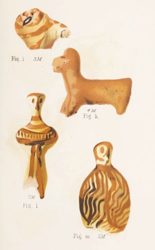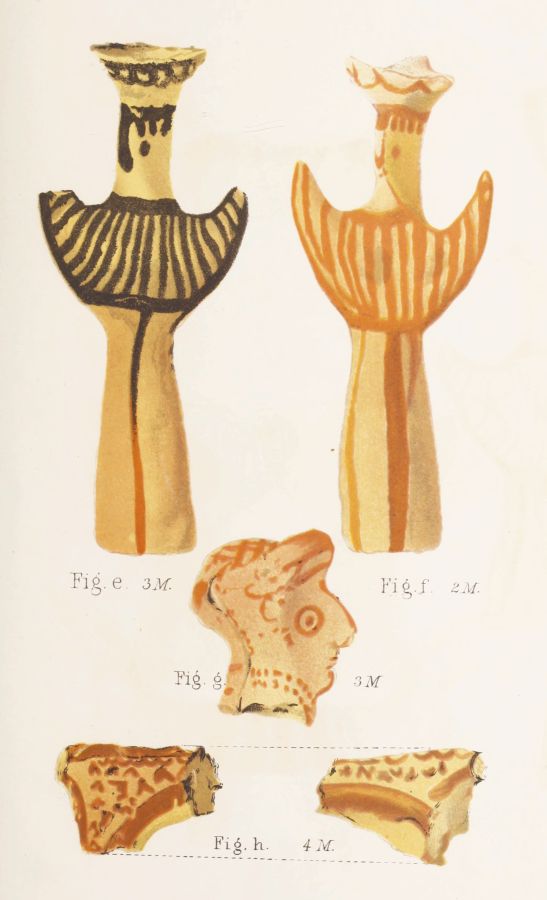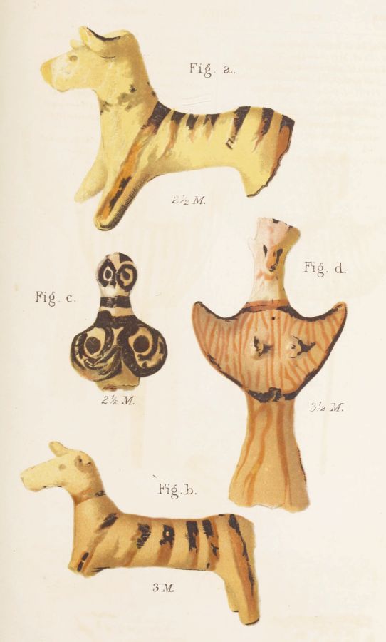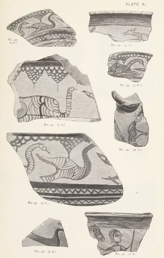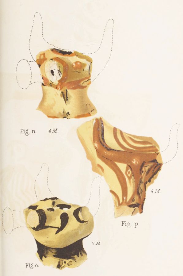 First, I have to offer some reflections on the general[xii] character of the discoveries, and on its relation to the state of Art exhibited in the Poems. It seems reasonable to believe, especially after what has been shown by Mr. Gardner respecting the four tombstones, that they constituted the contemporary seal of a great deposit. It results, I think, from the evidence before us that it is impossible to reduce to one school or style or stage of art the whole of the objects exhumed. But on this I would observe first that, although they were simultaneously deposited in honour of the dead, they might have been the productions of more than one generation: secondly, that not only are we not required, but, in so far as we draw light from the Homeric Poems, we are hardly permitted, to refer them collectively to a domestic origin.