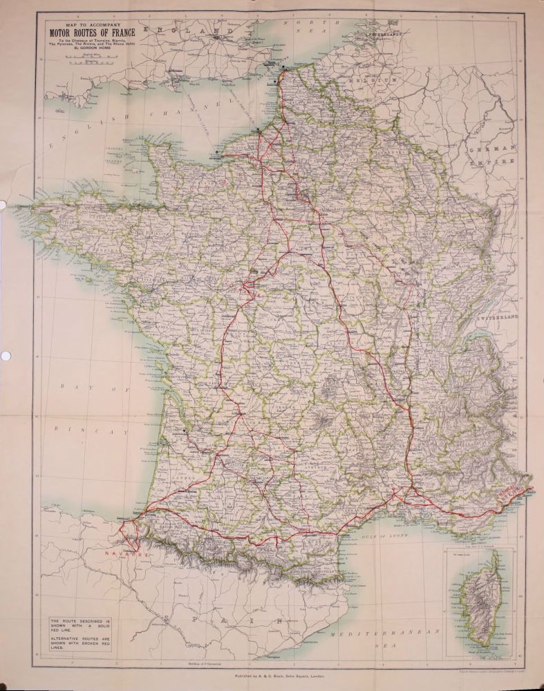 The fascination of a motor tour through France can scarcely be exaggerated. It is a country eminently suited to the new method of road travel, for with the spaces between the towns traversed by wide national ways going to their objectives as straight as the contours of the country will permit, no one feels that the presence of a rapid car is destroying the peace or beauty of the neighbourhood. And yet in the tour described in this book there is a huge diversity of scenery, from the wheat plains of the North to the mountains and sea of the South.