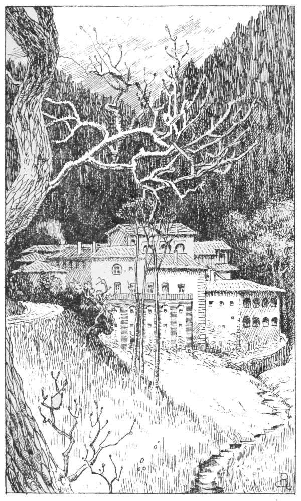 It had been cold and cheerless in the noisy Italian train rattling up from Arezzo. A dull, stormy sky gave a desolate aspect to the irregular country and cast a shadow over the rugged mountains. But as we climbed the hill of Bibbiena our spirits rose. Side valleys opening up in different directions revealed winding roads and castle-crowned elevations; Poppi, with its soaring tower, stood up in bold outline; the higher mountains, many of them snow-capped, seemed to unite in one bold, forcible sweep. Which of these heights sheltered Camaldoli,{3}