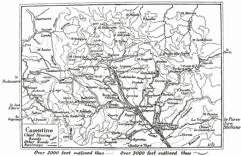 The Casentino is the name given to the upper valley of the Arno, where the river, rising in numerous streams on the slopes of the Falterona, flows southwards for about forty miles before it swings round in its course and runs north-westwards in the direction of Florence. The district, to use the words of a modern Italian writer, is “formed by nature in the shape of a basket”—those oval flower-baskets we see carried about the streets of Florence—“with its lowest part green with meadows, fields and vineyards, and encircled and, so to say, closed in by lofty mountains.” It is a district rich in memories of{2} Dante and other associations. The halo of early Christian life, the gloom and splendour of feudal times, and the glow of the Renaissance, all linger here. And many beauties of nature, many feasts of the imagination here await the traveller who foregoes for a time the hasty temper of the tourist.