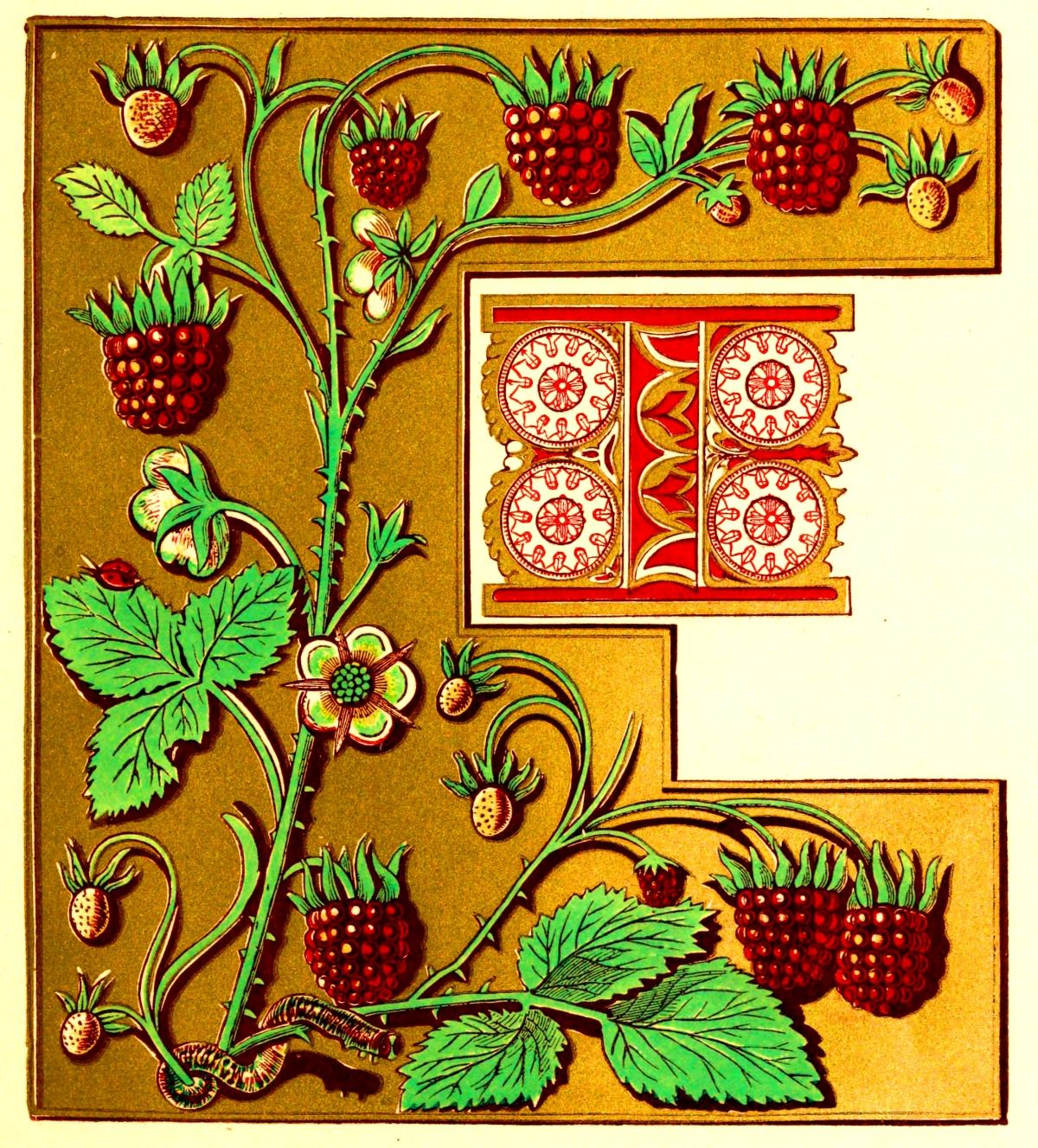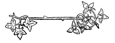 Nor will anything more materially promote this study than a careful consideration of the harmonies enumerated, as they are exhibited in nature, both animal and vegetable, but particularly the latter, as something of a bower seems the fundamental idea of all the better styles of the art. All sorts of creeping plants, whether in the garden or the hedgerow; all sorts of flowers, exotic, native, or wild—nay, fruits and many vegetables—as parsley, notably—may be pressed with advantage into the service of the art: whilst the graceful forms and beautiful plumage of the bird tribe, especially of the inhabitants of the Tropics; the equally brilliant though more delicate plumage of butterflies and moths; the symmetrical contour and tasteful combinations of colour in many quadrupeds; and even the homelier insects which crawl about our fruit trees, may be all studied with advantage. The old illuminators were frequently happy to avail [Pg 26] themselves of a caterpillar, or a lady bird, to break the monotony of a broad, flat space, or heighten the effect of a leaf, or balance a too obtrusive colour in an opposite corner. Reptiles, too, may contribute much that is exceedingly beautiful, both in outline and colour; and in this respect again the Tropics furnish the most brilliant specimens.