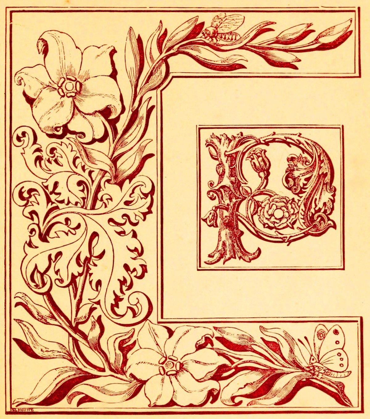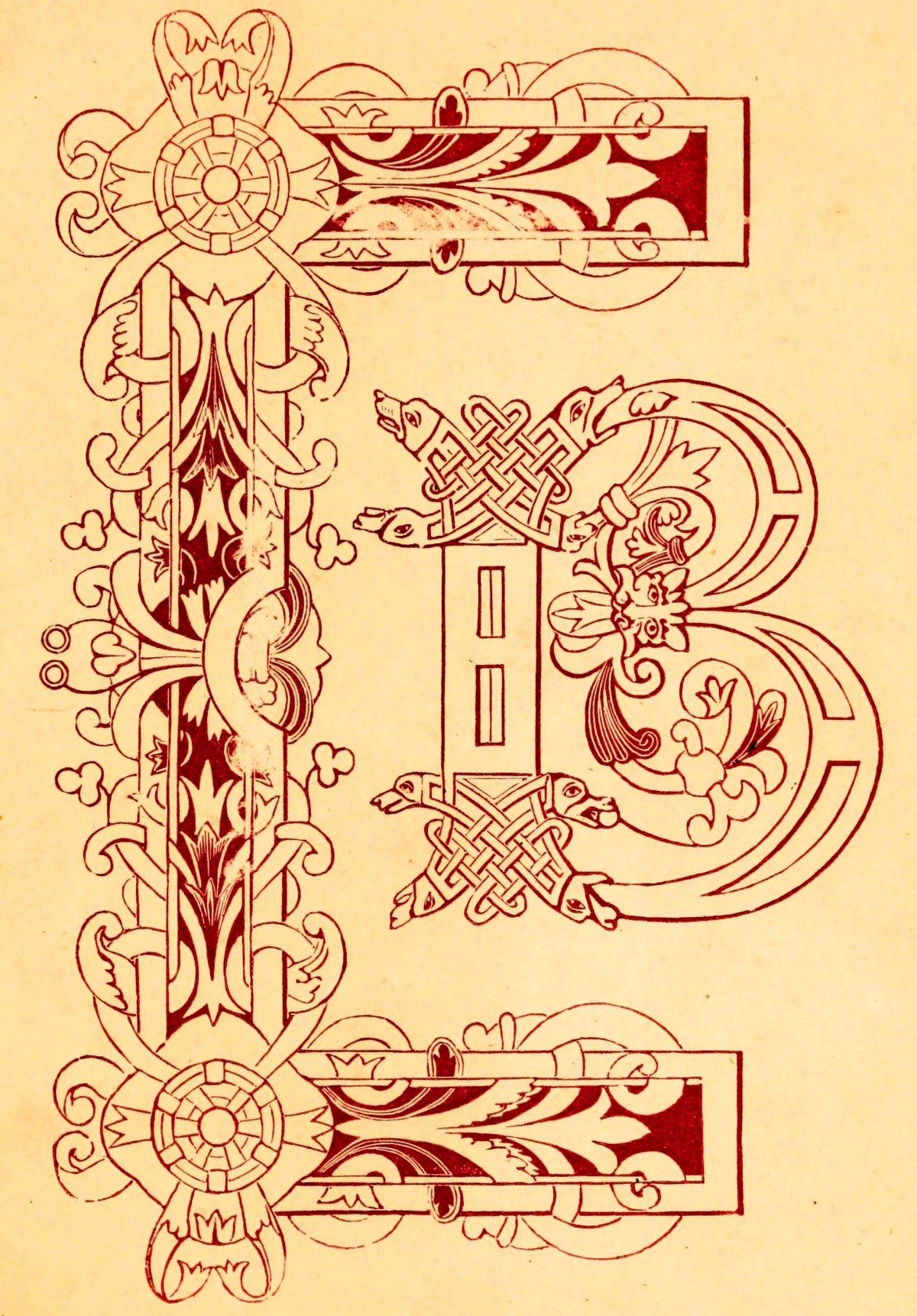 1st.—The component parts of the initial itself are made the subject of ornamentation; sometimes by the contortion of a dragon or some other pliable animal into a grotesque parody of the shape of the letter; sometimes by forming it of a combination of geometric figures, resulting from an endless crossing of lines, the whole terminating in heads or other parts of the same sort of creatures; sometimes by the introduction of foliage in a more or less integral manner.