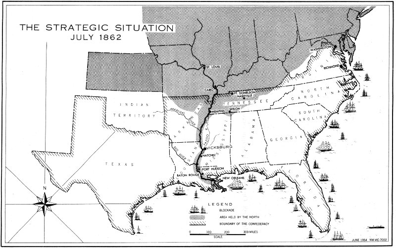 Control of the Mississippi River, whose course meandered over 1,000 miles from Cairo, Ill., to the Gulf of Mexico and divided the Confederacy into almost equal parts, was of inestimable importance to the Union from the outbreak of hostilities. The agricultural and industrial products of the Northwest, denied their natural outlet to markets down the great commercial artery to New Orleans, would be afforded uninterrupted passage. It would provide a safe avenue for the transportation of troops and their supplies through a tremendous area ill-provided with roads and railroads; the numerous navigable streams tributary to the Mississippi would offer ready routes of invasion into the heart of the South. Union control would cut off and isolate the section of the Confederacy lying west of 2 the river—Texas, Arkansas, and most of Louisiana—comprising almost half of the land area of the Confederacy and an important source of food, military supplies, and recruits for the Southern armies. Forcefully emphasizing the strategic value of the Mississippi was the dispatch of the General in Chief of the Union armies to Maj. Gen. U. S. Grant on March 20, 1863, as Grant prepared to launch his Vicksburg campaign: