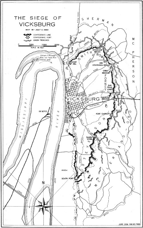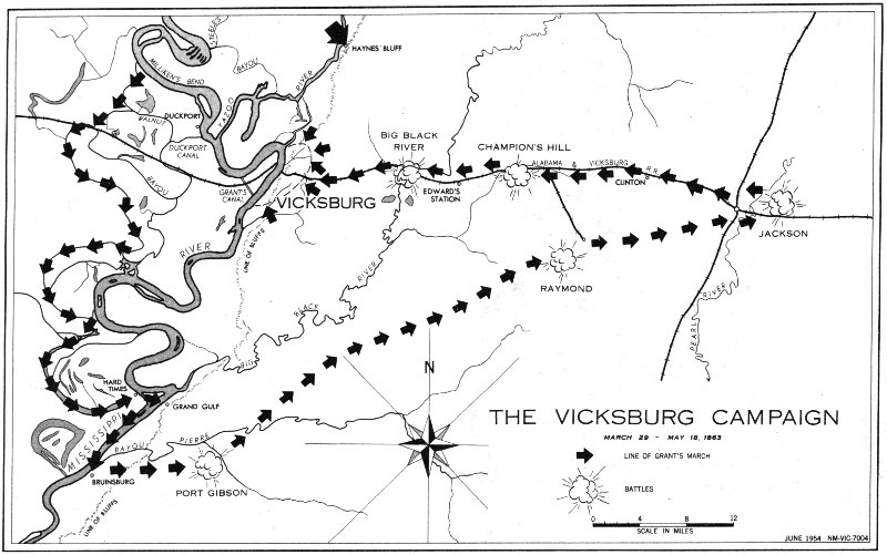 Across the imperishable canvas of the American Civil War are vividly recorded feats of arms and armies, and acts of courage and steadfast devotion which have since become a treasured heritage for all Americans. Among the military campaigns, few, if any, present action over so vast an area, of such singular diversity, and so consequential to the outcome of the war, as the great struggle for control of the Mississippi River. Seagoing men-of-war and ironclad gunboats engaged shore defenses and escorted troops along river and bayou; cavalry raids struck far behind enemy lines as the armies of the West marched and countermarched in a gigantic operation which culminated in the campaign and siege of Vicksburg. Protected by heavy artillery batteries on the riverfront and with land approaches to the north and south guarded by densely wooded swamplands, Vicksburg defied large-scale land and river expeditions for over a year. Finally the tenacious Grant, in a campaign since accepted as a model of bold strategy and skillful execution, forced the surrender of Vicksburg on July 4, 1863, splitting the Confederacy in two and securing for the North its great objective in the Western Theater.