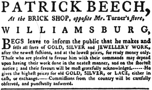 WILLIAMSBURG,BEGS leave to inform the public that he makes and sells all sorts of GOLD, SILVER and JEWELLERY WORK, after the newest fashions, and at the lowest prices, for ready money only. Those who are pleased to favour him with their commands may depend upon having their work done in the neatest manner, and on the shortest notice; and their favours will be most gratefully acknowledged.... He gives the highest prices for old GOLD, SILVER, or LACE, either in cash, or exchange.... Commissions from the country will be carefully observed, and punctually answered.