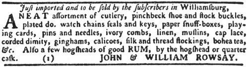A NEAT assortment of cutlery, pinchbeck shoe and stock buckles, plated do. watch chains seals and keys, paper snuff-boxes, playing cards, pins and needles, ivory combs, linen, muslins, cap lace, corded dimity, ginghams, calicoes, silk and thread flockings, bohea tea, &c. Also a few hogsheads of good RUM, by the hogshead or quarter cask. (1) JOHN & WILLIAM ROWSAY.